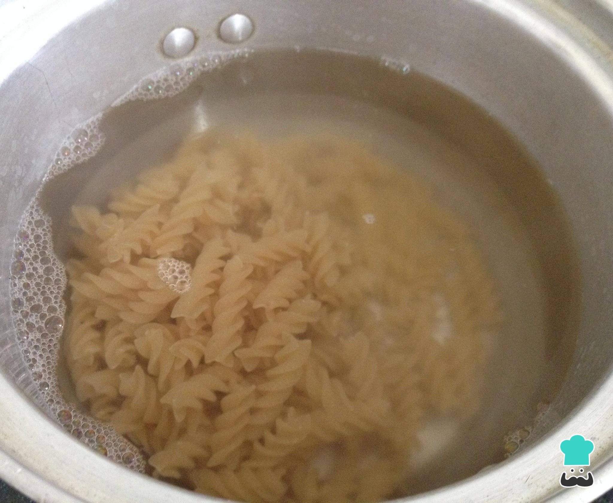 Em uma panela com água fervente e sal, coloque o macarrão e deixe cozinhar por 15 minutos, até estar no ponto (al dente).