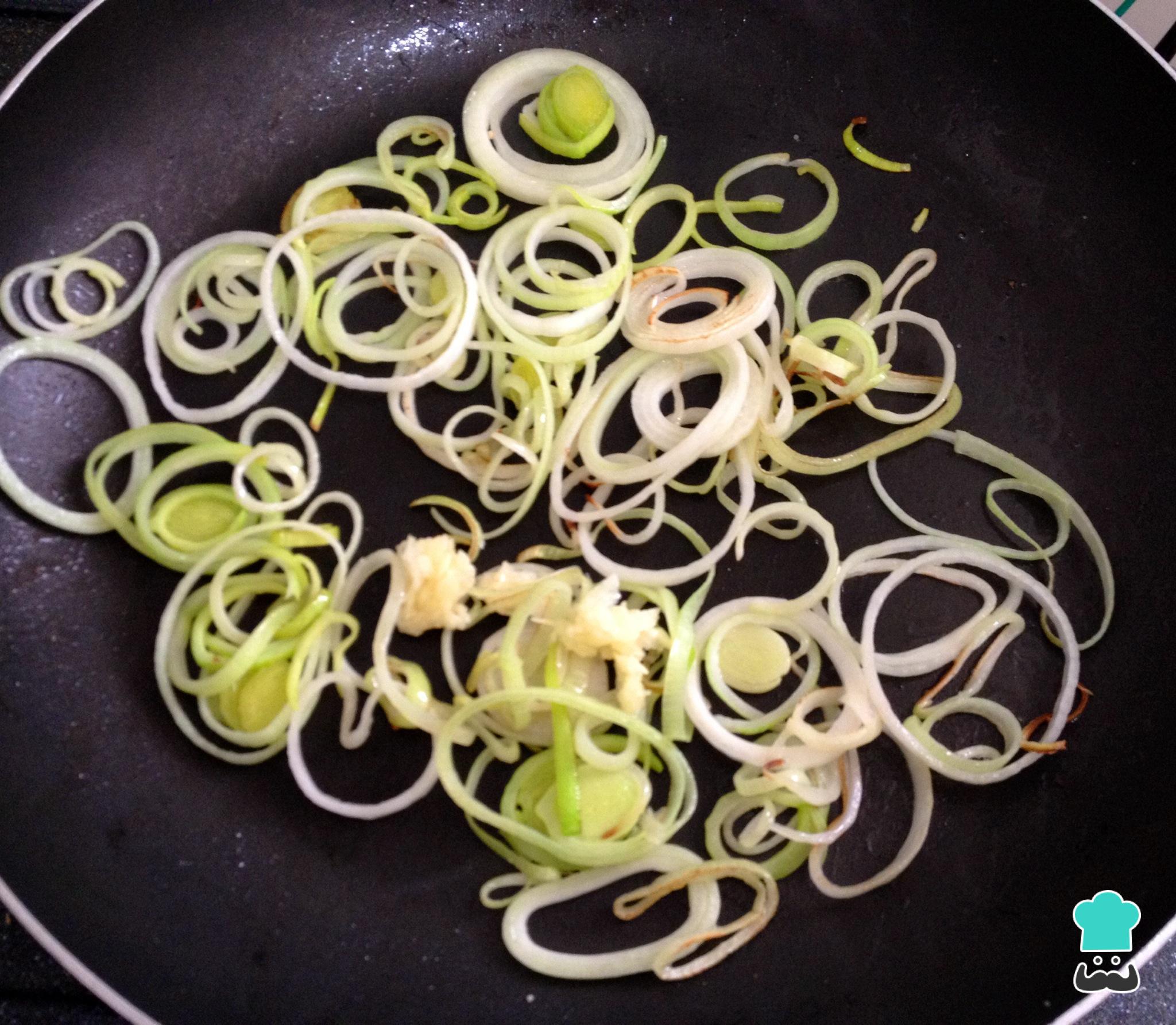 Separadamente em uma frigideira com óleo, refogue o alho-poró cortado às rodelas com o alho por 3 minutos com um pouco de sal, mexa constantemente para evitar que se queime.