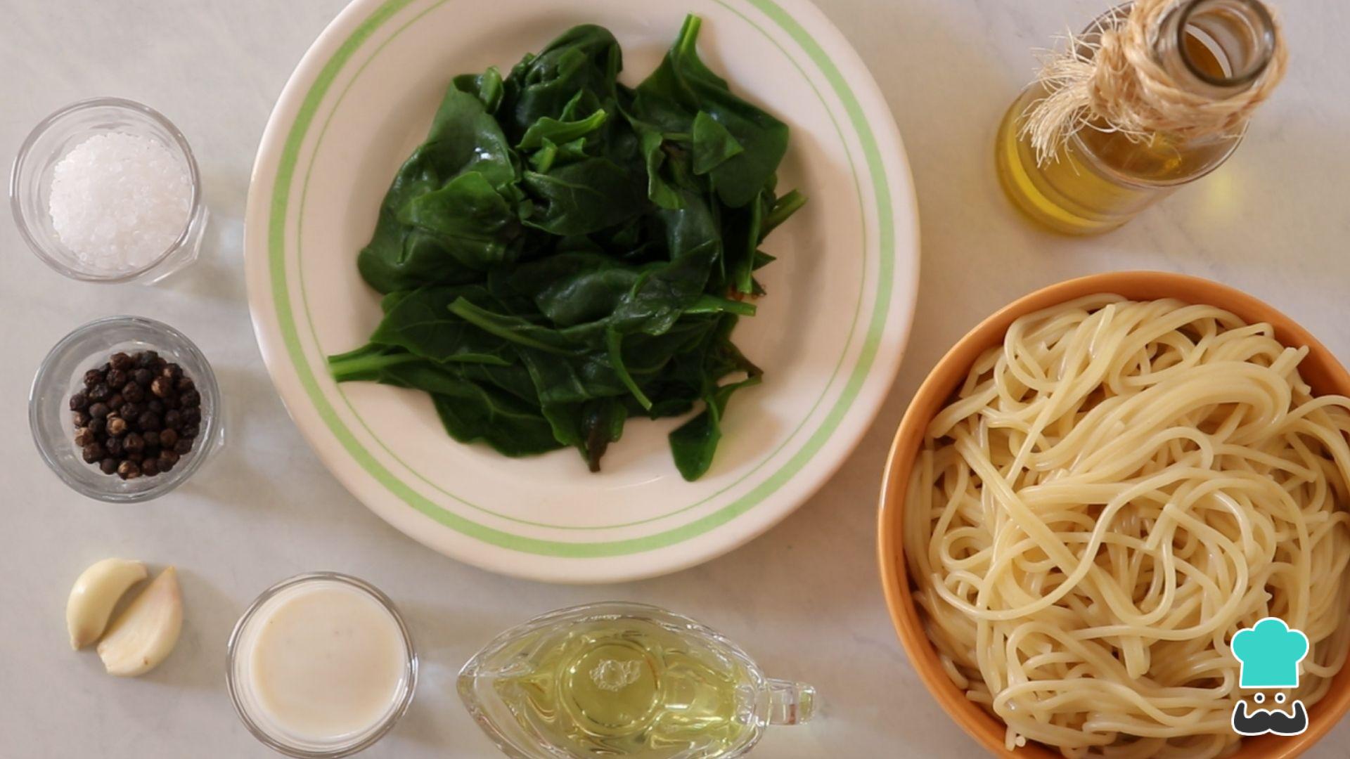 Comece essa receita de macarrão com espinafre. Separe os ingredientes. Cozinhe o macarrão de acordo com as instruções da embalagem. Lave bem, retire do talo e cozinhe o espinafre em água com sal por 2 minutos. Retire o espinafre cozido e reserve a água - você vai usá-la na hora de colocar a verdura no liquidificador.