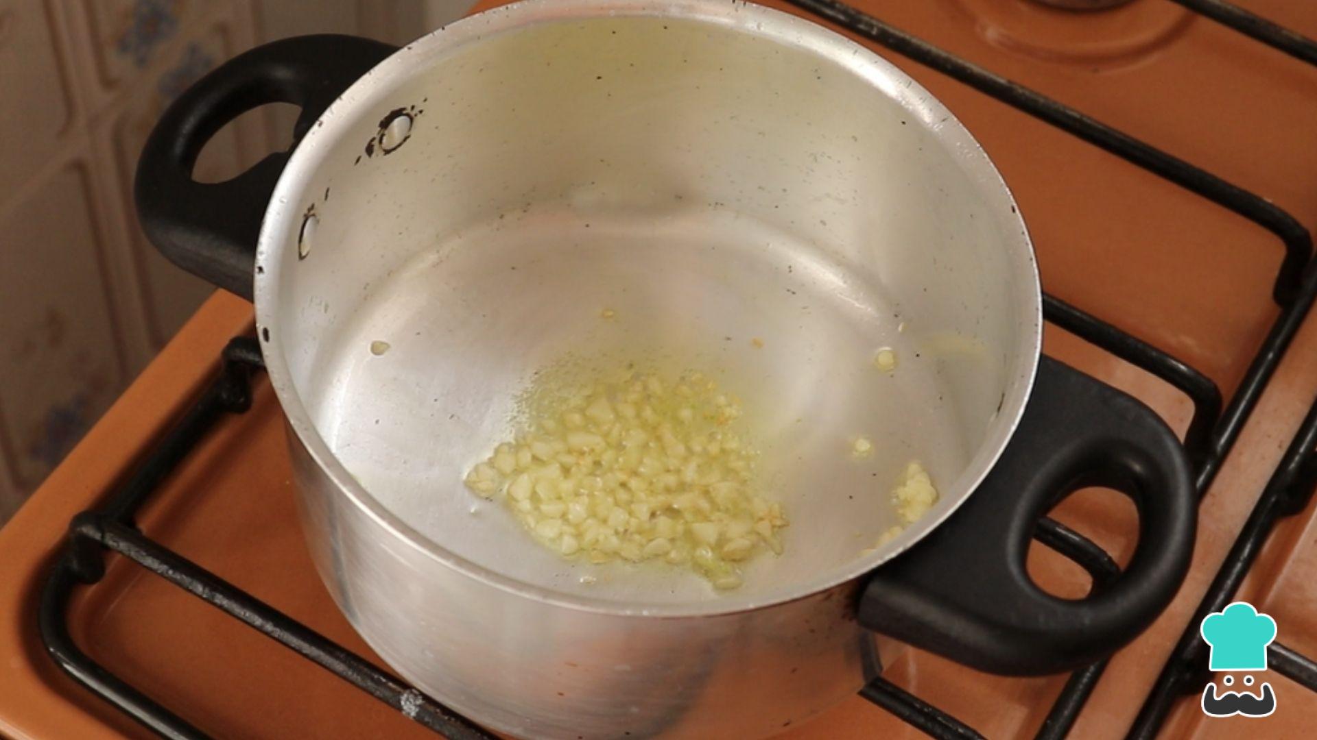 Leve uma panela ao fogo médio, despeje o azeite doure o alho. Fique de olho para não queimar, senão o gosto compromete toda a receita.