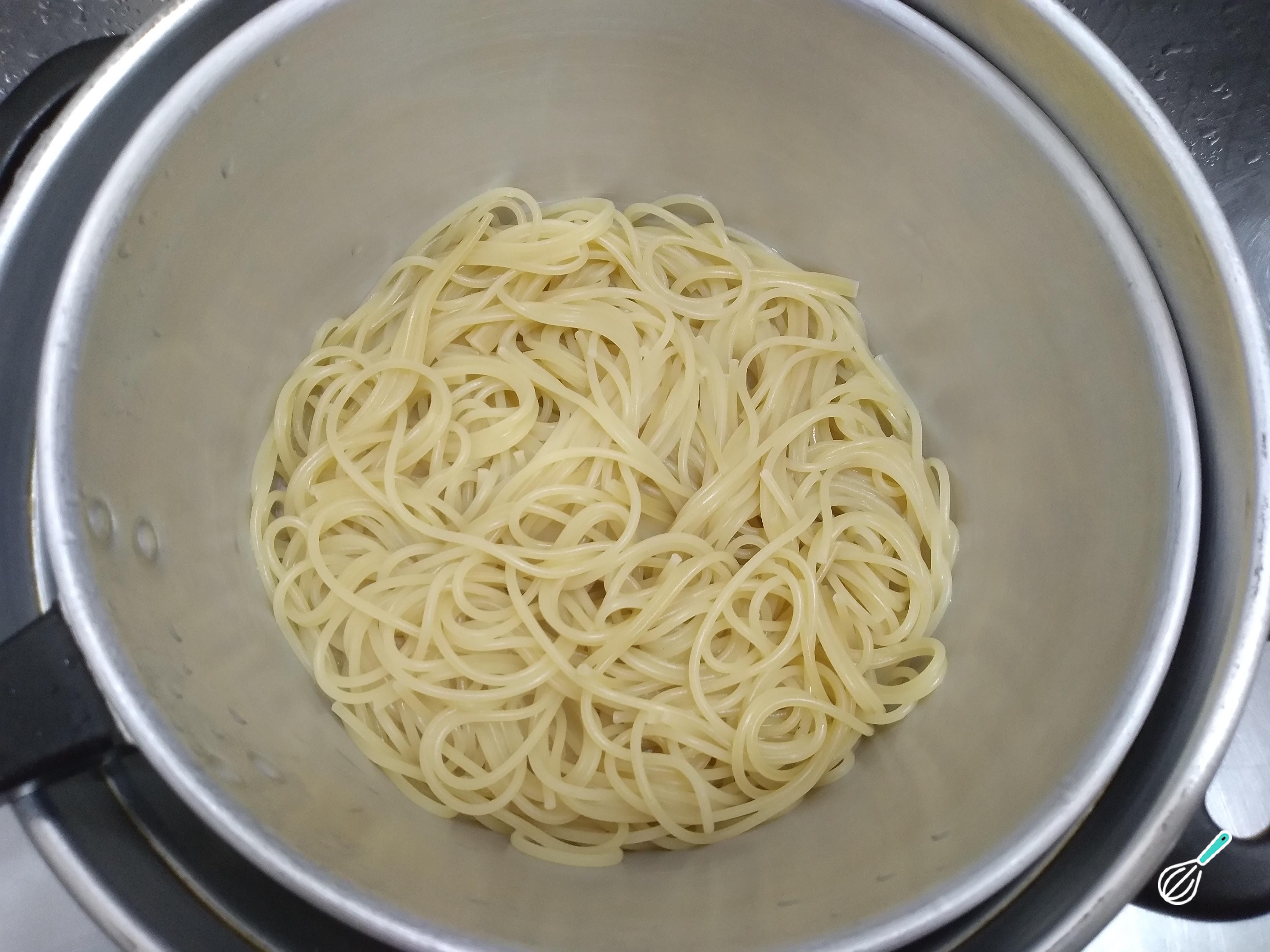 Assim que o macarrão estiver no ponto desejado, escorra num escorredor de macarrão.