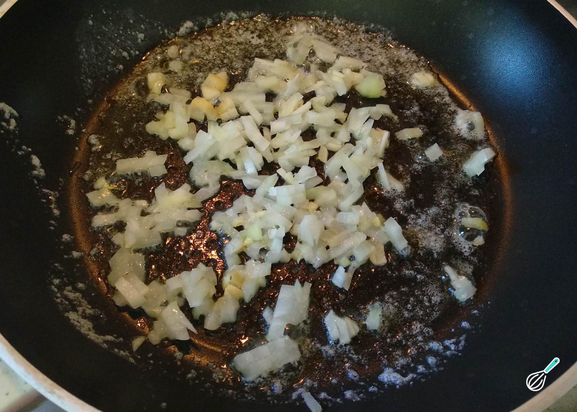Leve ao fogo baixo também uma frigideira com metade da manteiga. Quando derreter, coloque a cebola e os alhos e deixe refogar até a cebola ficar transparente.