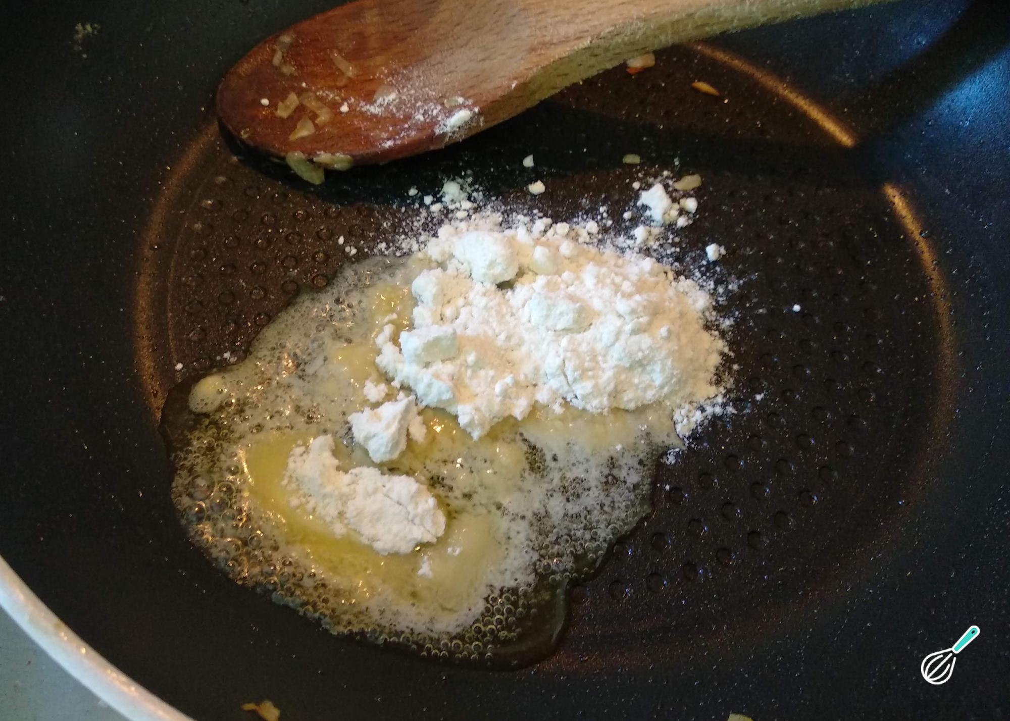 Na mesma frigideira coloque a restante manteiga e a farinha de trigo. Misture até virar uma pasta.