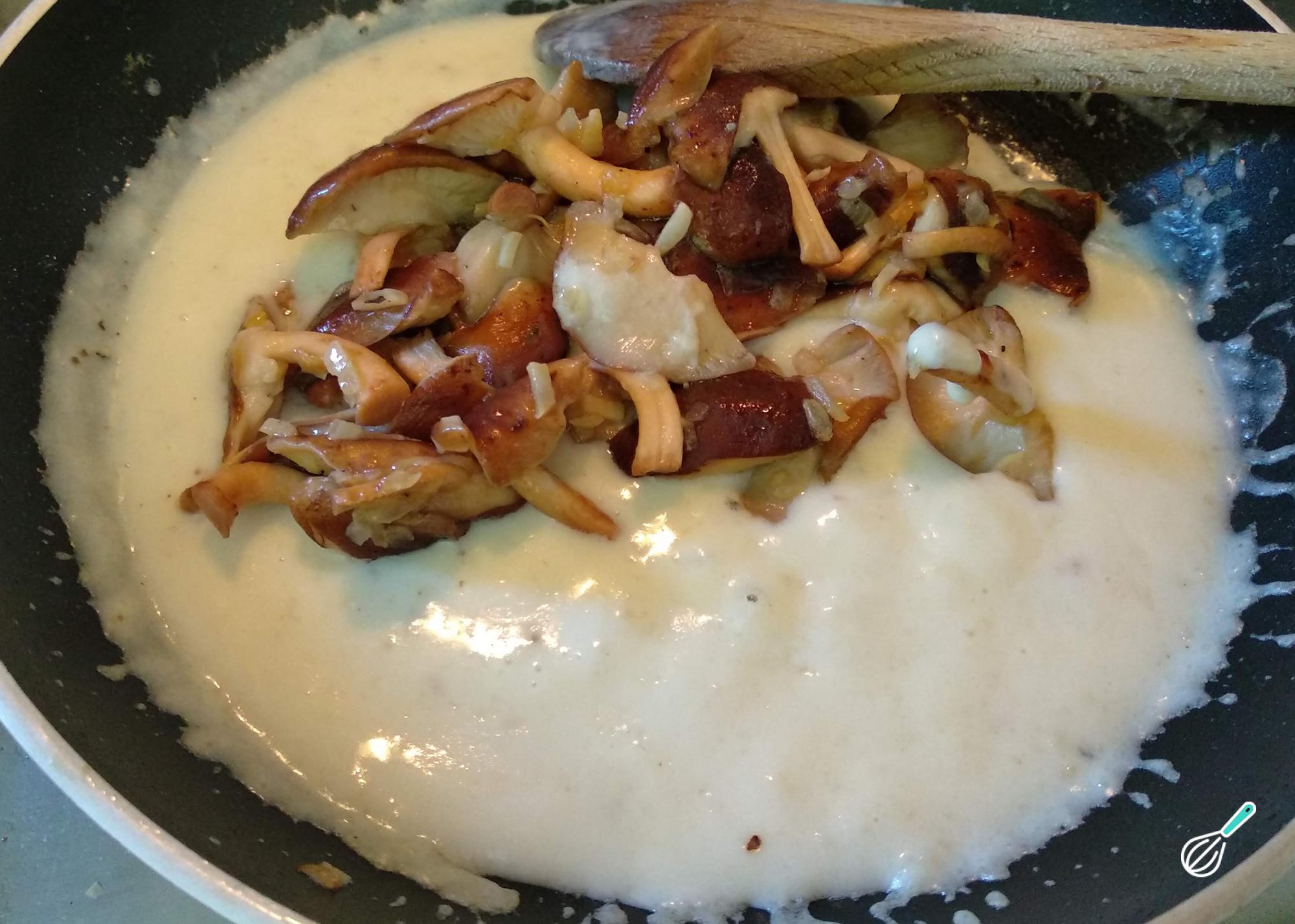 Quando terminar de adicione o leite, volte com os cogumelos na frigideira e tempere a gosto com sal e pimenta. Envolva bem, mexa até engrossar e desligue o fogo.