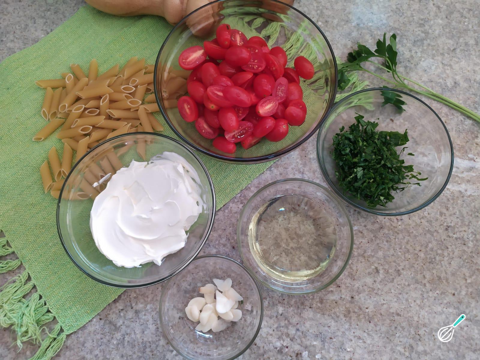 Comece separando os ingredientes para massa com tomate cereja e queijo.