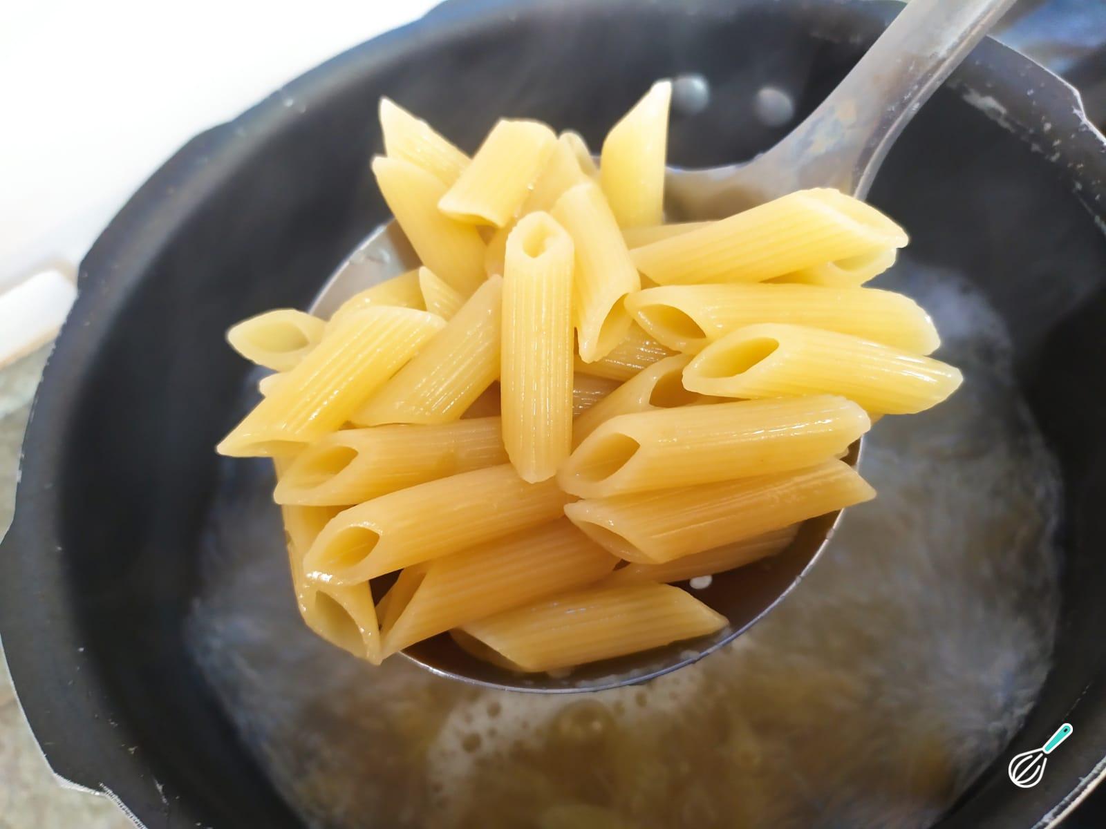 Agora coloque a água e um pouco de sal em uma panela grande e deixe ferver. Quando levantar fervura, adicione o macarrão deixando cozinhar por aproximadamente 9 minutos, até ficar al dente.