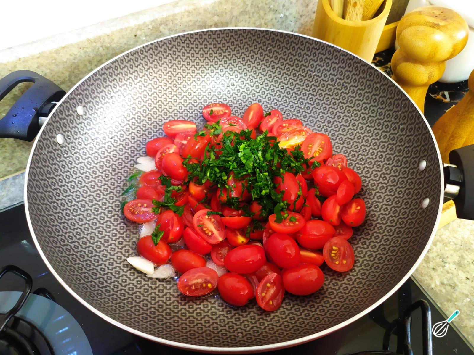 Em seguida, junte os tomates limpos e cortados ao meio, a salsinha picada e refogue em fogo médio. Tempere com sal e pimenta do reino à gosto.