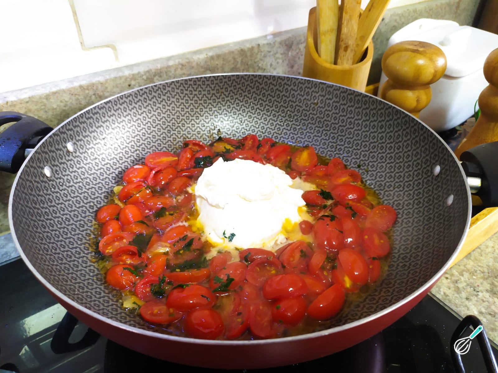 Quando o tomate estiver mole, acrescente o queijo cremoso (cream cheese) e deixe aquecer.