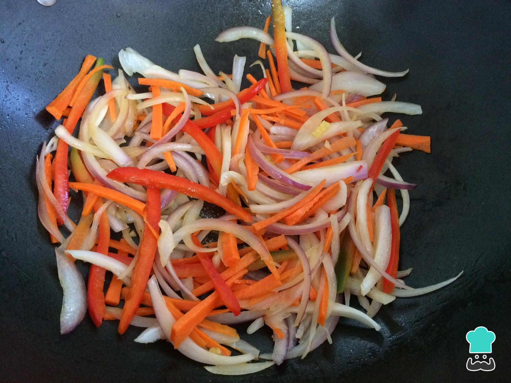 Em uma frigideira com um pouco de óleo, refogue os legumes começando pela cebola, pimentão e cenouras.
