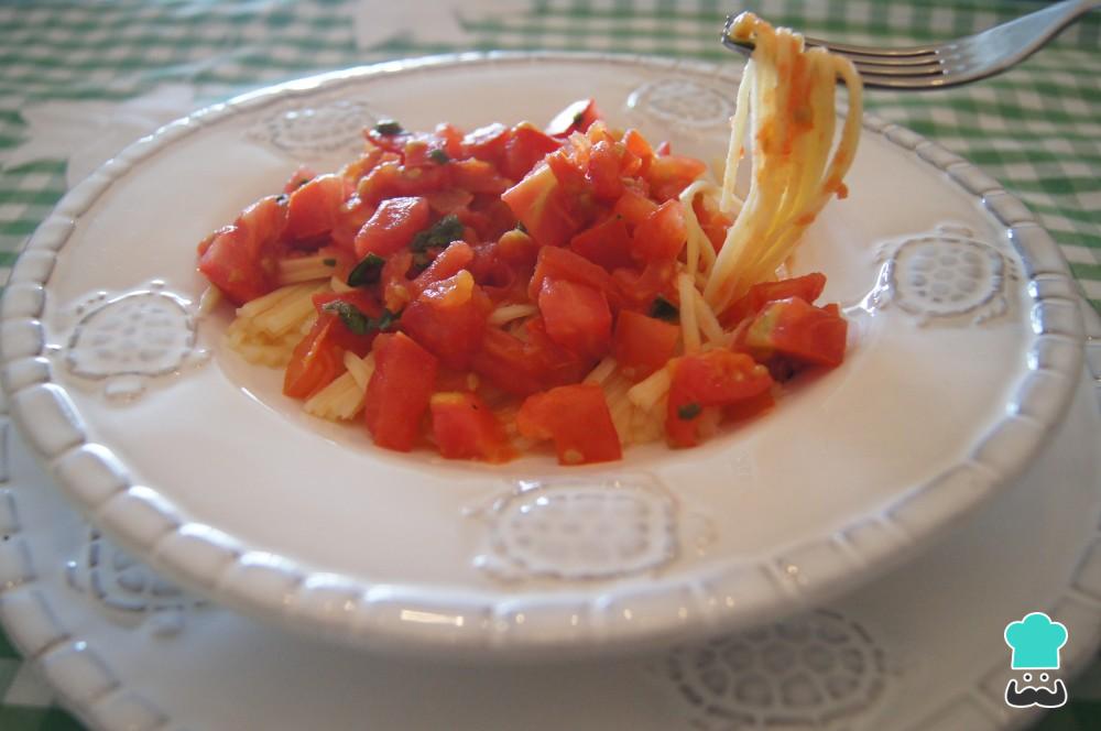 Numa frigideira dom um pouco de óleo, refogue a cebola cortada em tirinhas e o tomate cortado em pedaços. Quando estiverem prontos, junte o palmito e tempere com sal, manjericão e alho em pó a gosto. Desligue o fogo quando o macarrão de palmito atingir a consistência desejada.
