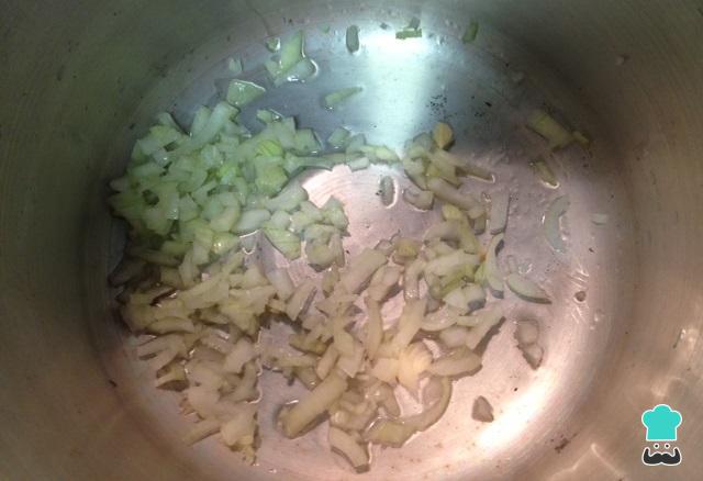 O primeiro passo para preparar o macarrão de panela de pressão é colocar a carne refogando na panela de pressão junto com o azeite, a cebola e o alho picados.