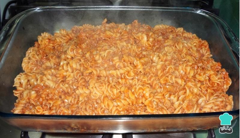 Quando a carne estiver ligeiramente dourada, acrescente a água, o macarrão, o creme de leite com o fermento dissolvido e o molho de tomate, que pode ser caseiro.