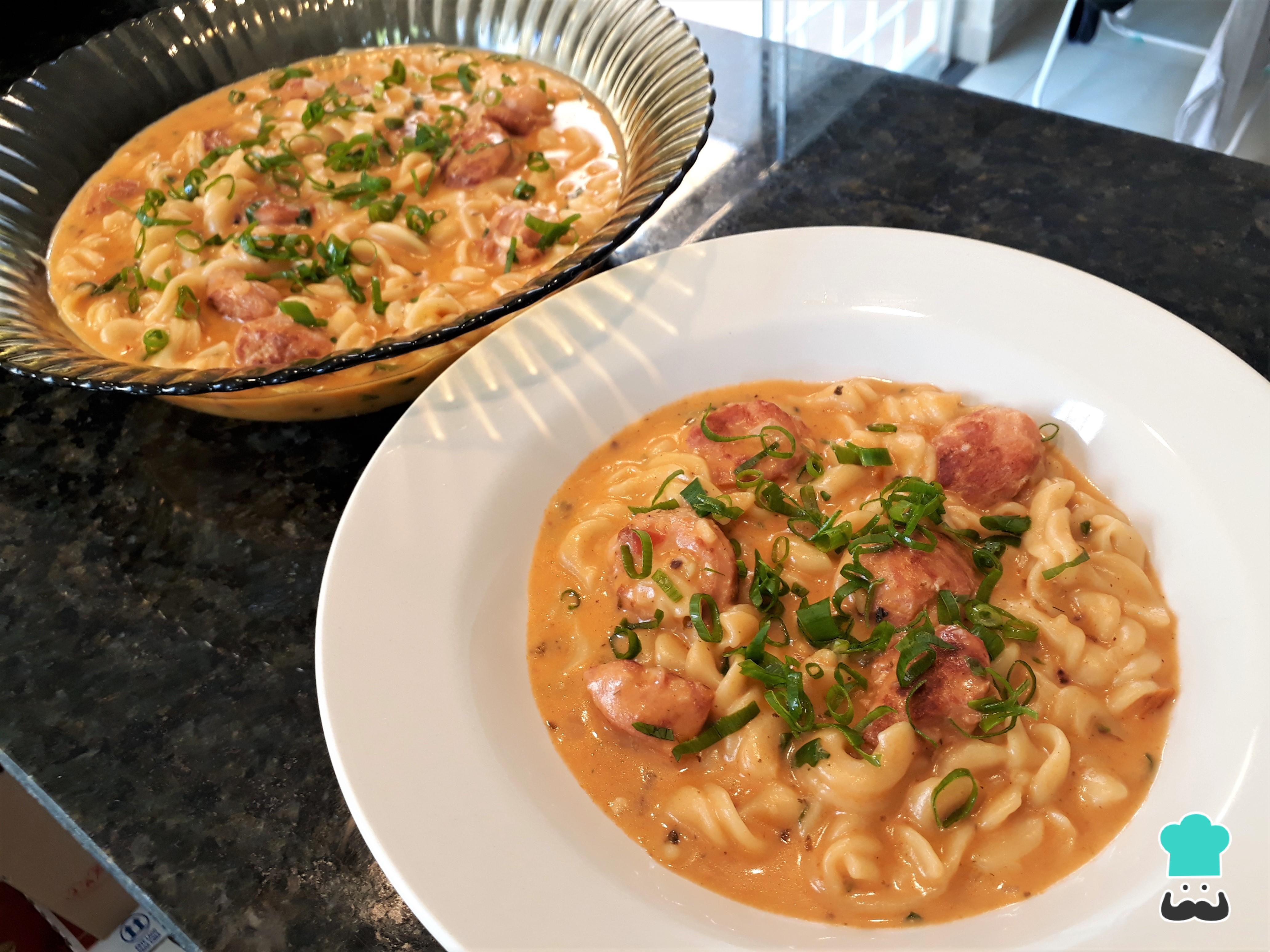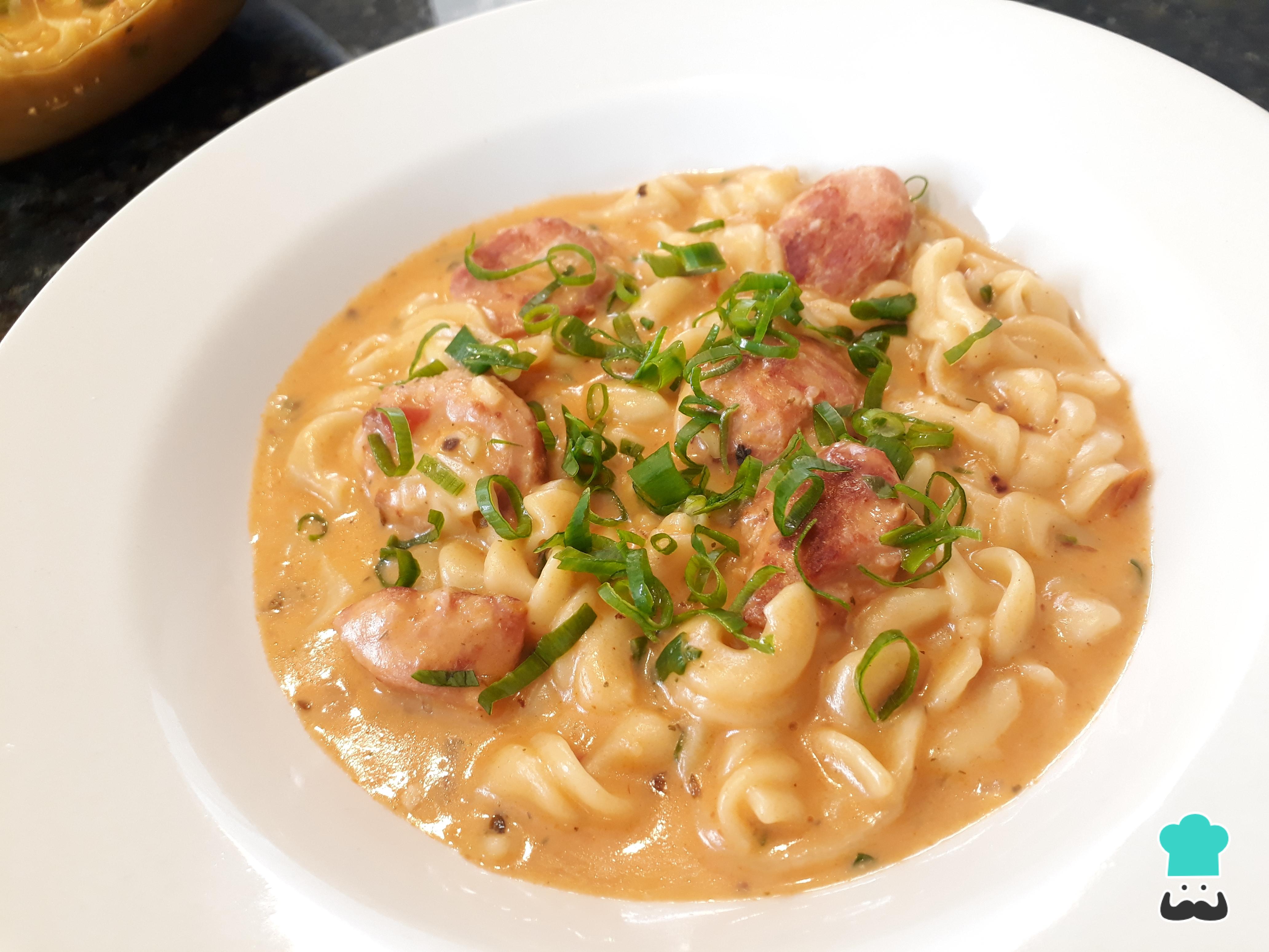 Retire a pressão, acrescente o requeijão cremoso e finalize com cheiro verde. Está pronto seu macarrão com linguiça cremoso na panela de pressão! Prove e diga nos comentários o que você achou.