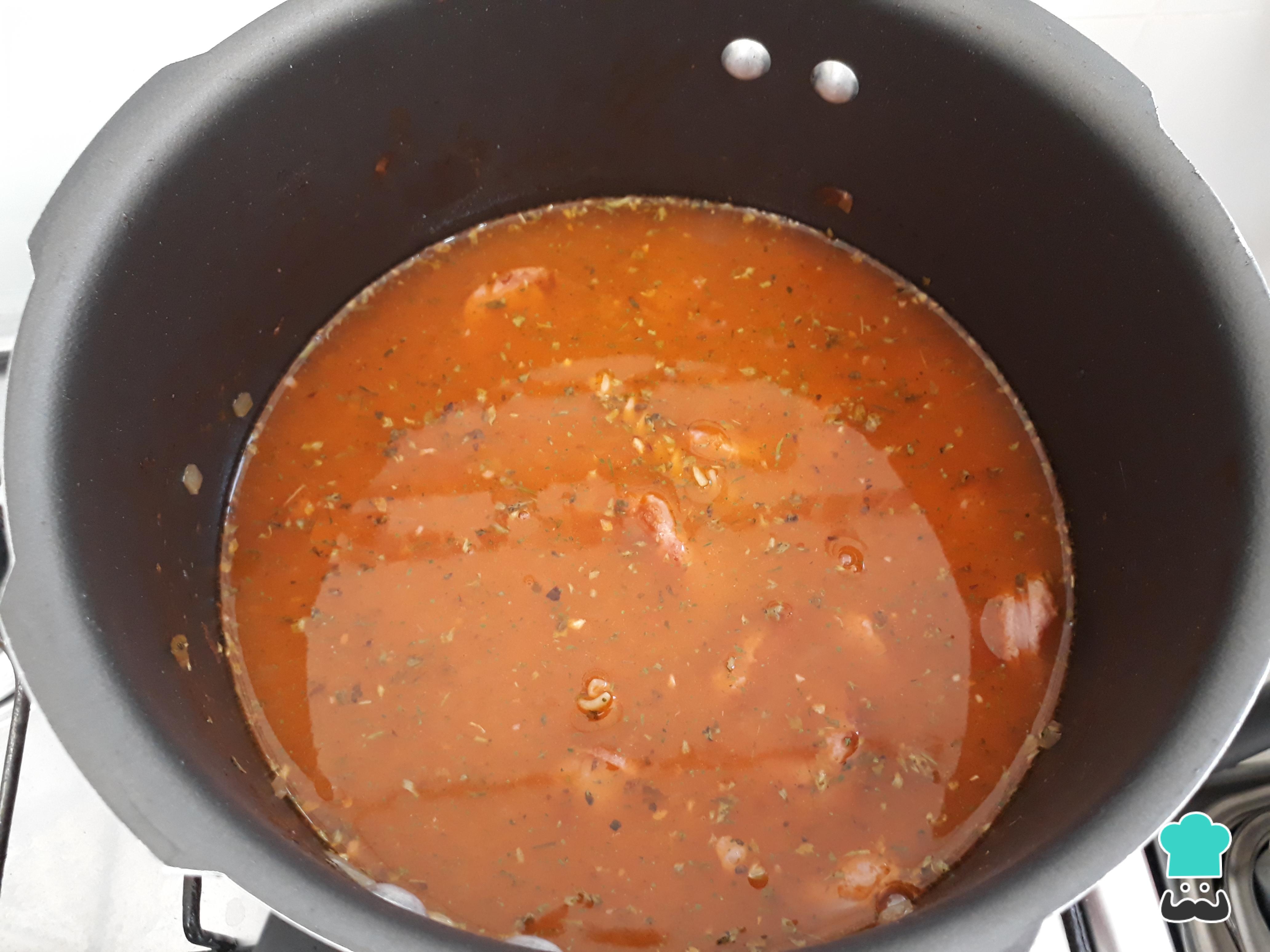 Coloque a água, o orégano e acerte o sal. Experimente um pouquinho do caldo para saber se está de acordo com o seu paladar.