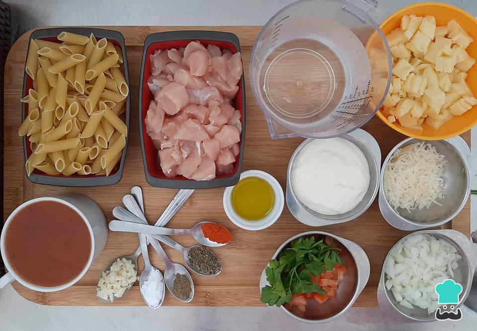 Separe todos os ingredientes necessários para preparar a receita de macarrão penne de panela de pressão com frango. Neste caso usei penne e minha dica é para dar preferência a um tipo de macarrão curto, a fim de facilitar a cocção e para que o molho tenha aderência melhor à massa.