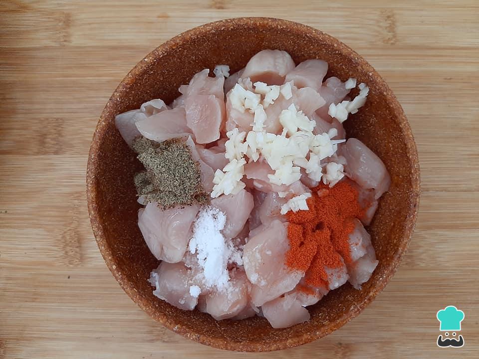 Limpe o frango e corte-o em cubos pequenos ou médios. Tempere-o com sal, pimenta do reino, páprica e alho amassado. Reserve por alguns minutos, para pegar melhor o tempero.