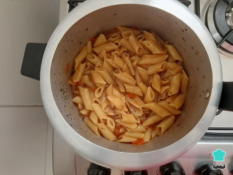 Após o tempo indicado, espere a pressão sair normalmente, abra a panela com segurança e confira se o macarrão está cozido, porém firme (al dente, esse é o ponto certo).