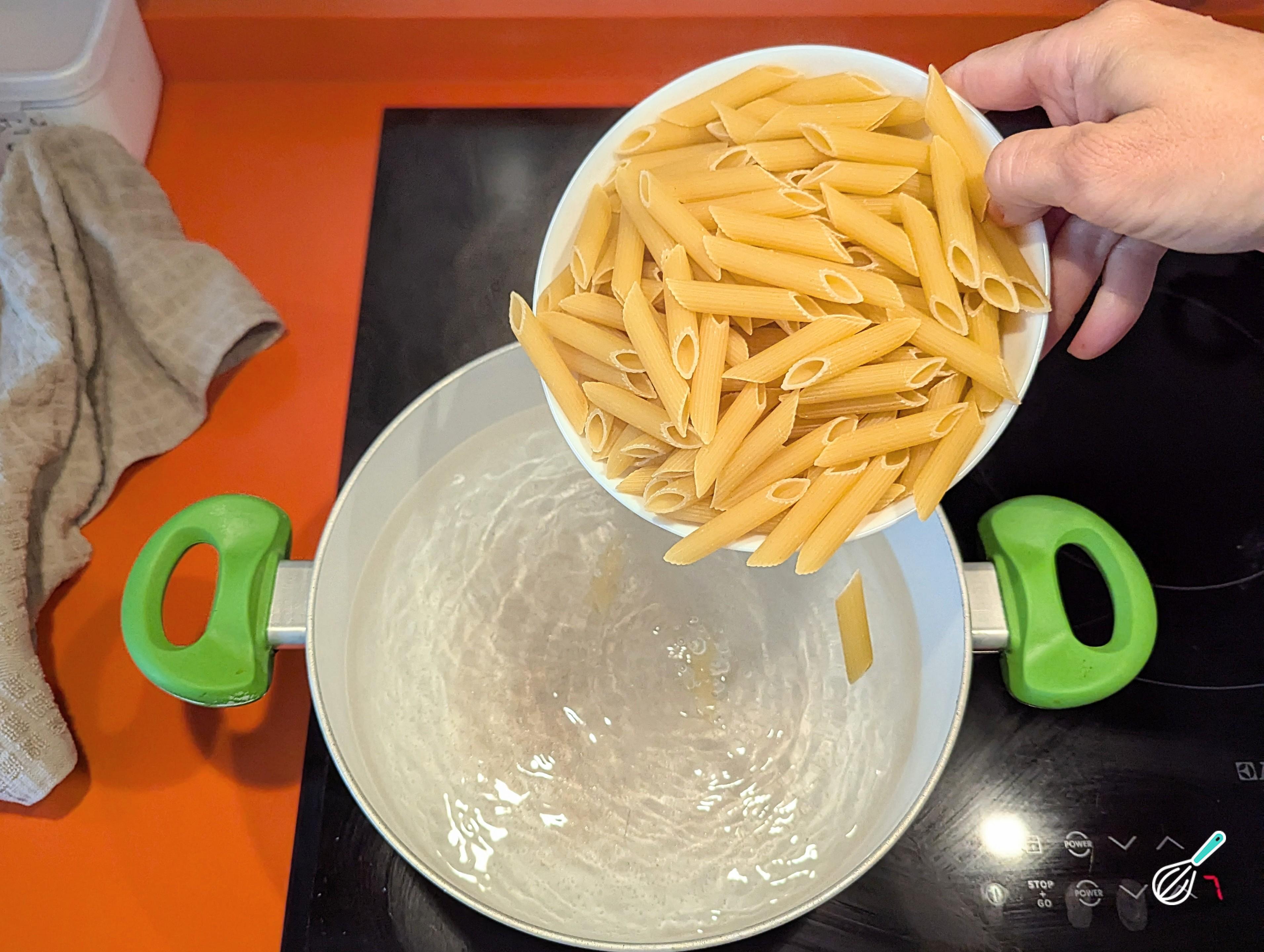 Assim que ferver, adicione uma pitada generosa de sal e acrescente o macarrão penne. Cozinhe em fogo médio até ficar al dente, ou seja, cozido, mas ainda firme ao morder.