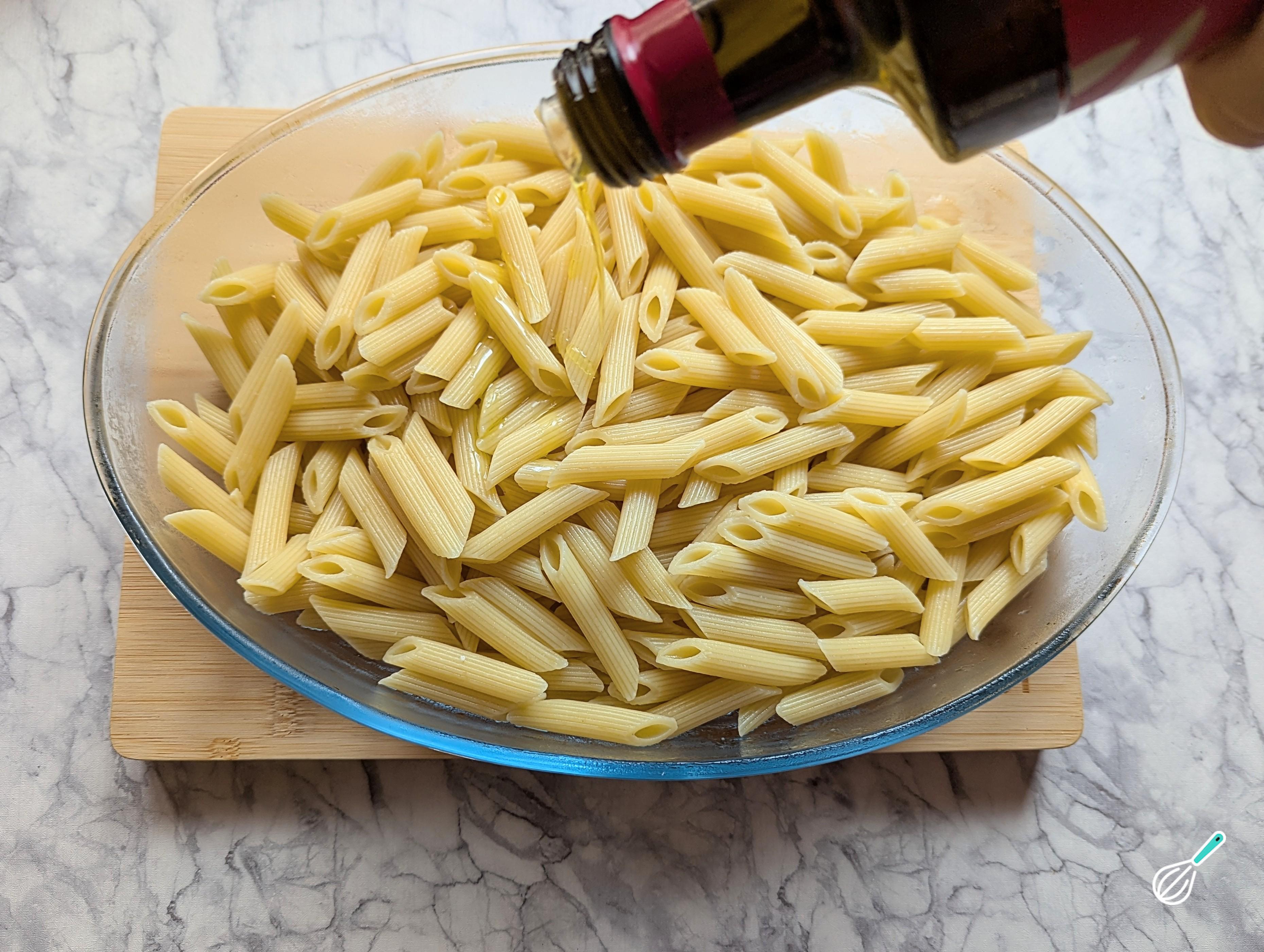 Quando estiver pronto, escorra a água e transfira o macarrão para uma travessa de vidro. Adicione um fio de azeite e mexa um pouco. Reserve.