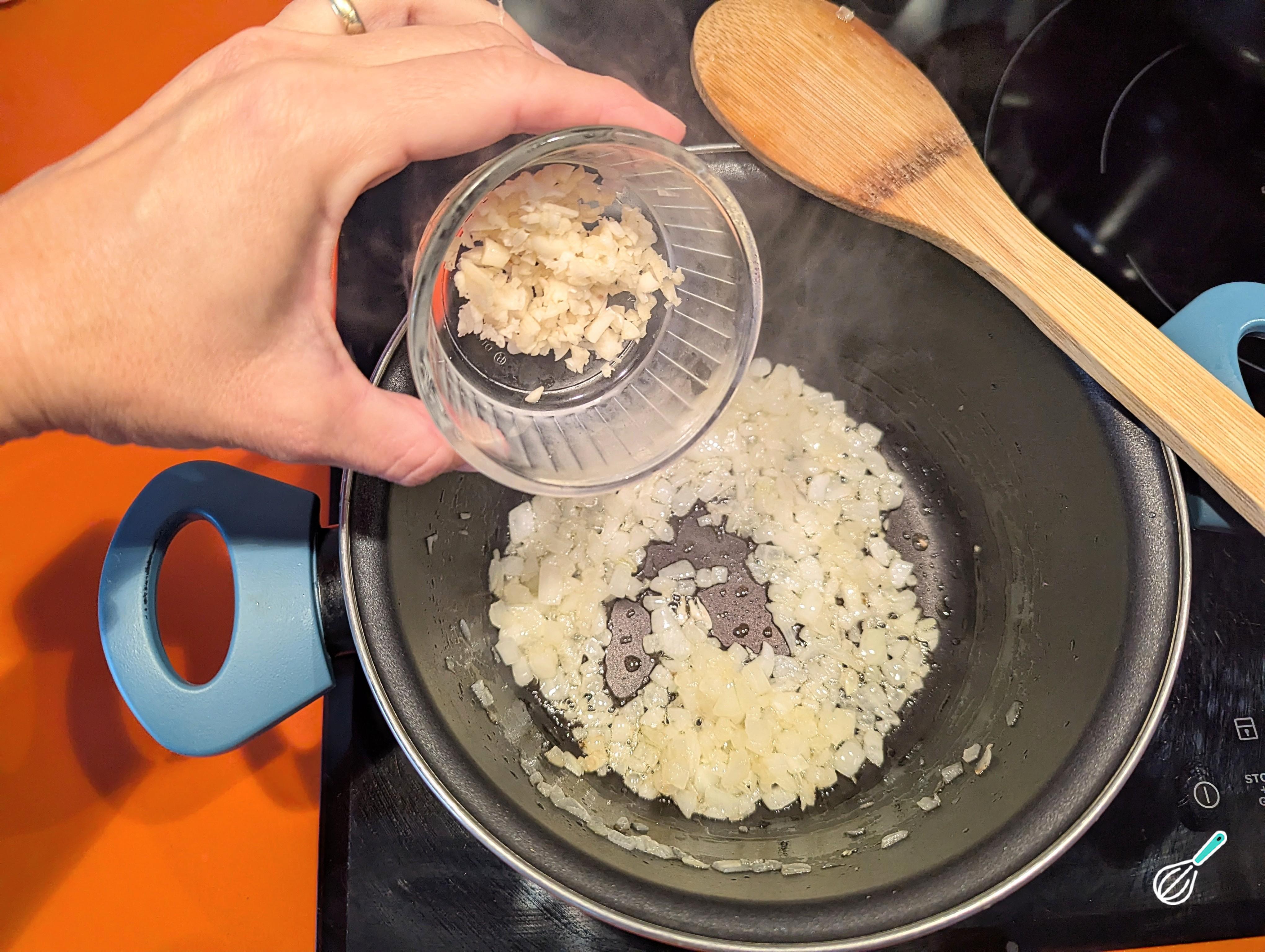 Acrescente o alho picado e refogue por mais um minutinho, tomando cuidado para não queimar.