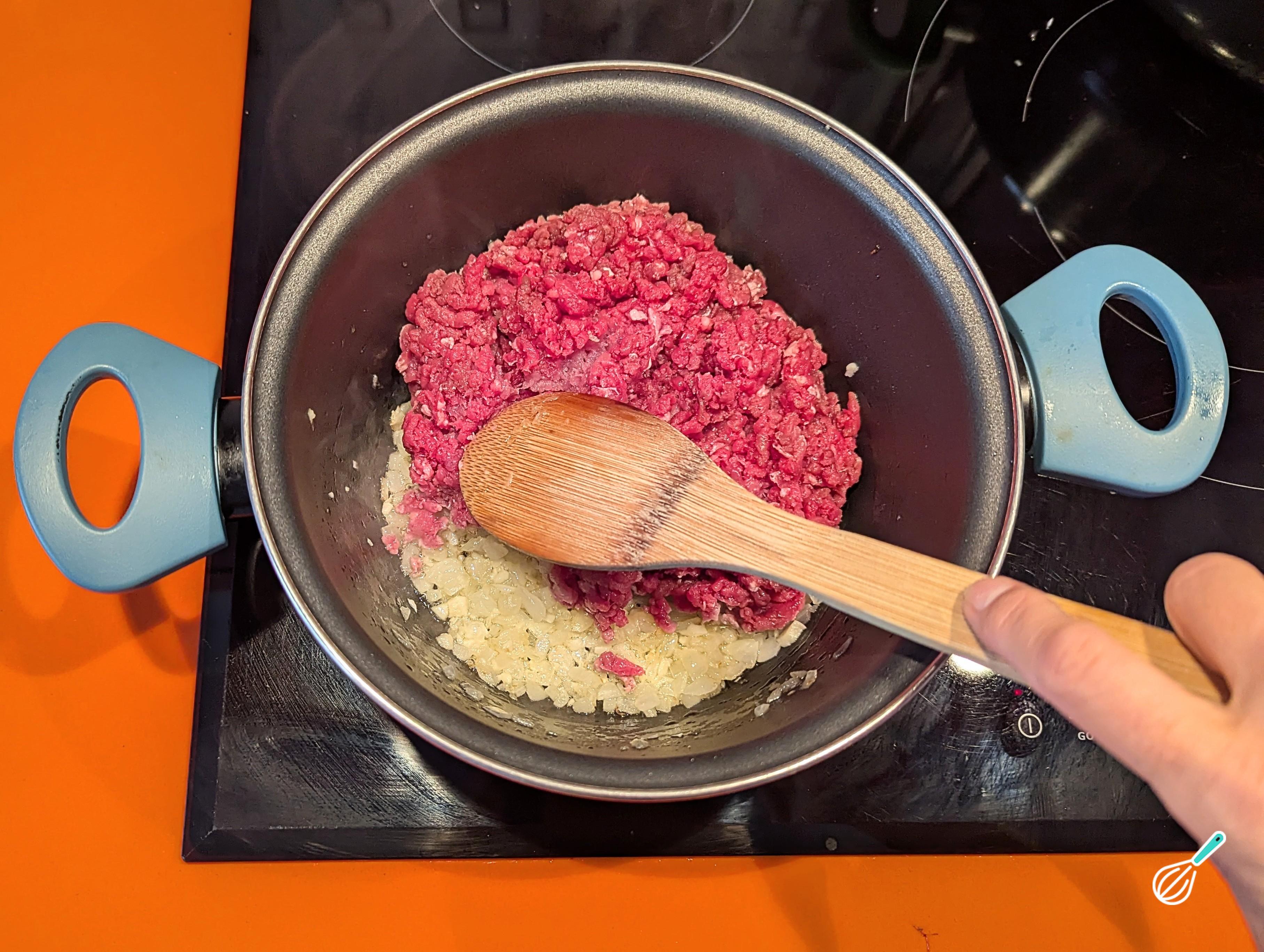 Coloque a carne moída na panela, mexendo bem para que ela fique soltinha. Deixe dourar até ela perder o tom rosado e ficar levemente tostada em alguns pontos.
