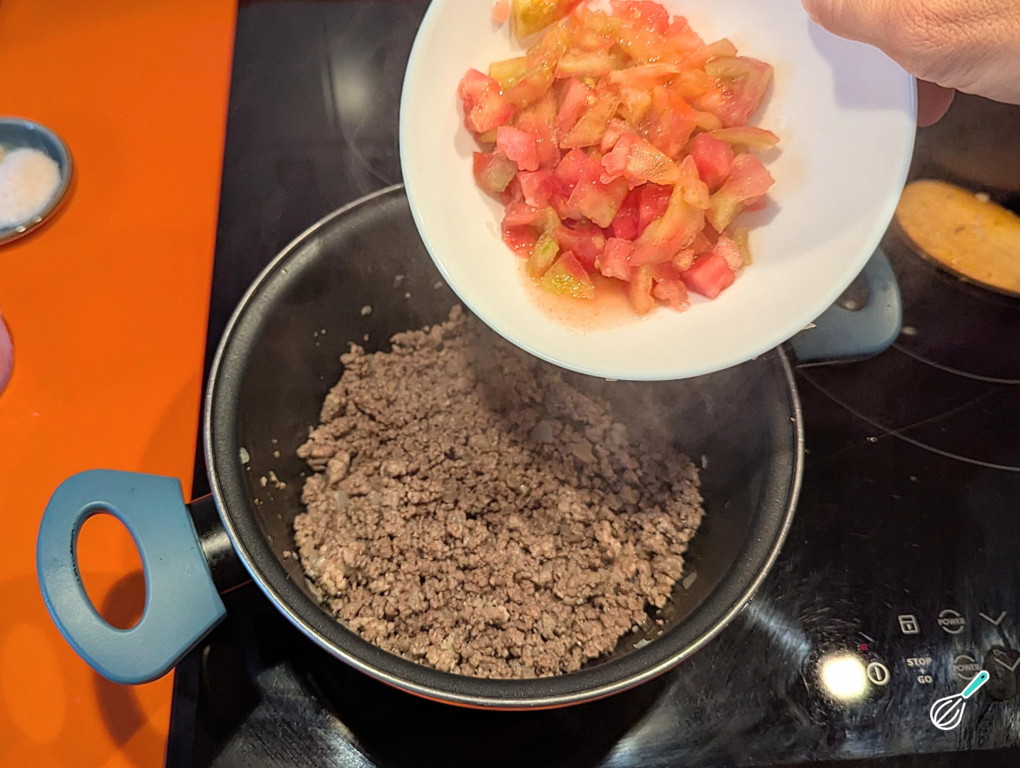 Adicione o tomate picada e refogue por mais 2 ou 3 minutos, até ele começar a se desmanchar.