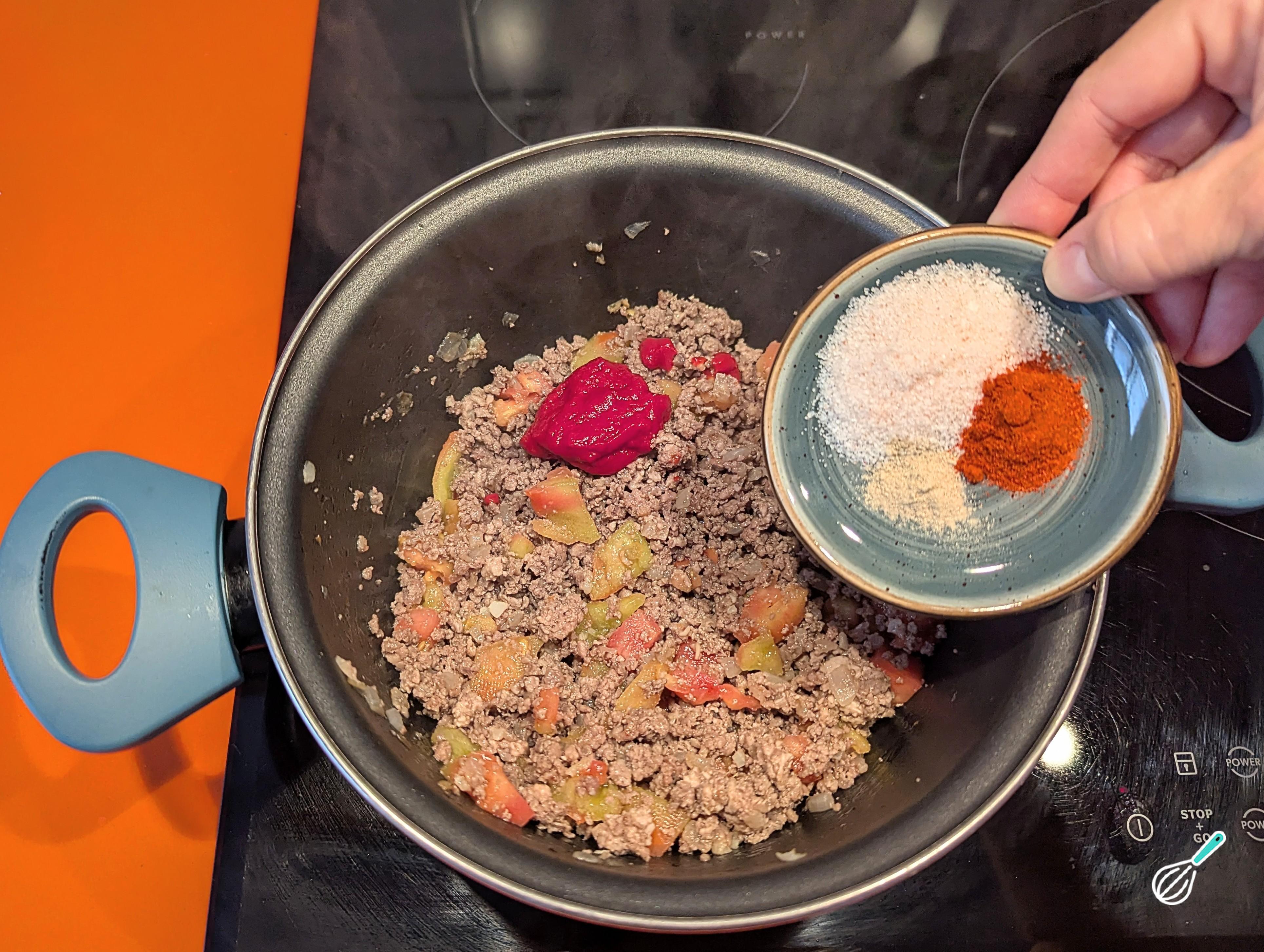 Em seguida, acrescente o extrato de tomate, a páprica doce, o sal e a pimenta branca a gosto. Misture bem e, se necessário, coloque um pouquinho de água para deixar o molho mais molhadinho. Cozinhe por mais uns 5 minutos, mexendo de vez em quando, para os sabores se incorporarem.