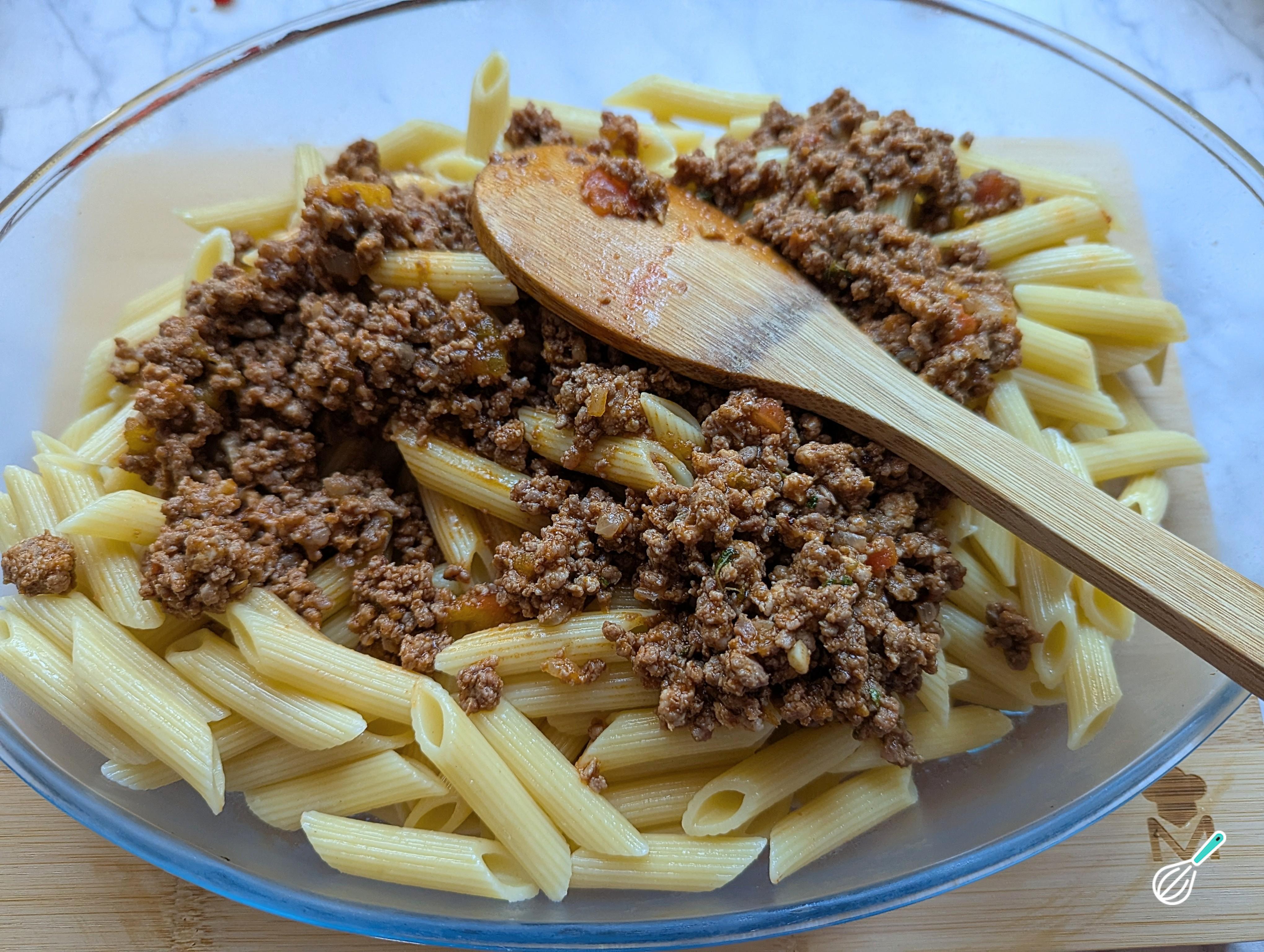 Agora você pode escolher: misture o molho de carne moída diretamente ao penne já cozido que estava na travessa reservado, ou então, sirva o penne no prato e coloque o molho por cima.