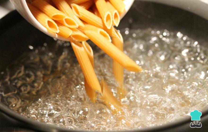 Comece cozinhando o penne sem glúten na água, conforme as instruções da embalagem da massa. Quando estiver al dente, escorra a água e reserve.
