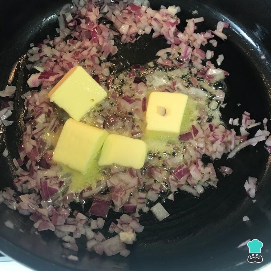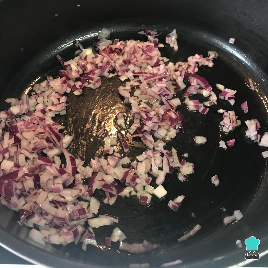 O passo seguinte desta receita de penne na manteiga com sálvia é, em uma frigideira grande, refogar a cebola no azeite até murchar.