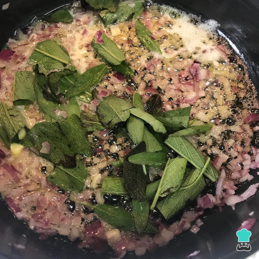 Coloque a sálvia picada e mexa por cerca de 5 minutos, para a erva soltar bem o seu aroma.