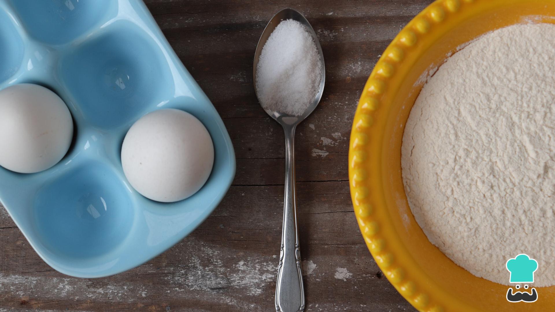 Separe os ingredientes, que são apenas três: ovos, farinha de trigo e sal.