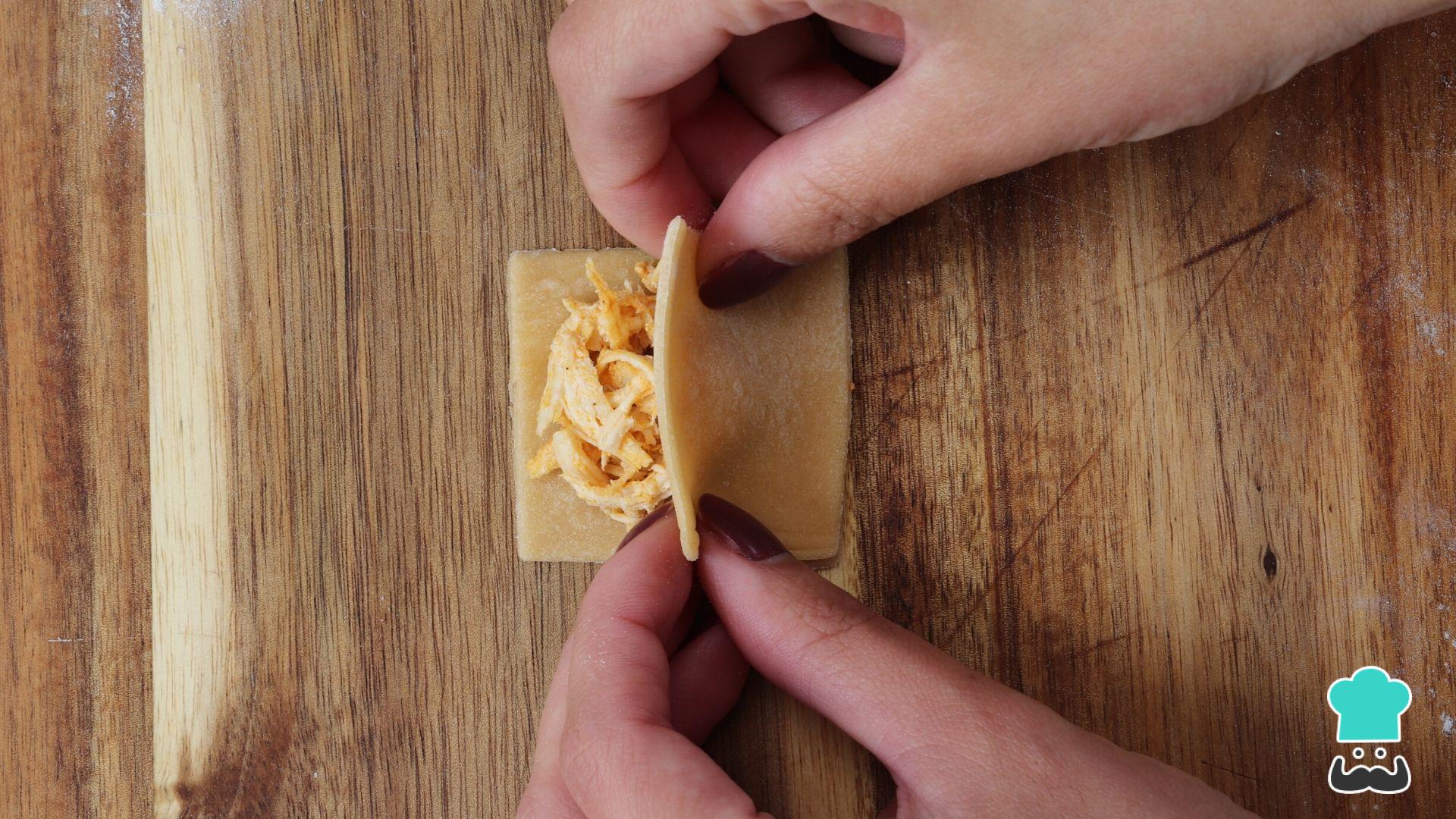 É importante fechar bem a massa para não correr o risco do recheio sair durante o cozimento. Para isso, use as pontas dos dedos para selar as bordas (se necessário umedeça com um pouquinho de água para grudar melhor) ou use um as pontas do garfo para unir a massa.