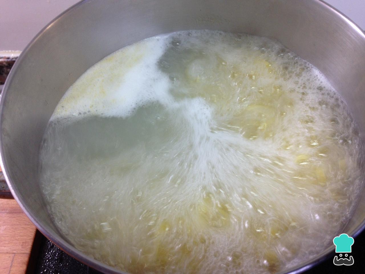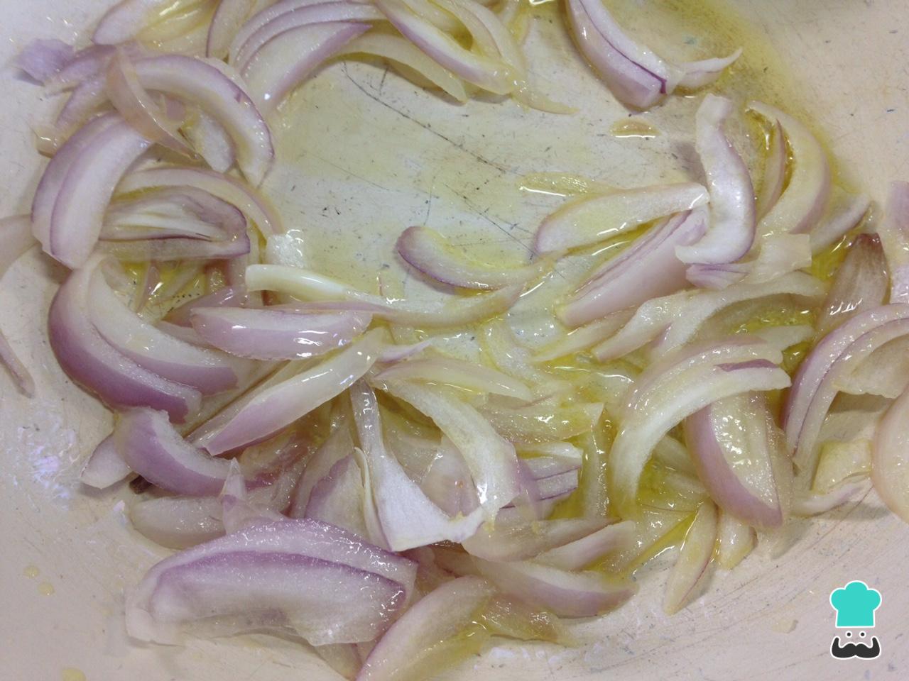 Coloque para ferver uma panela com água abundante e, quando espera, refogue a cebola cortada em meias-luas numa frigideira com azeite.