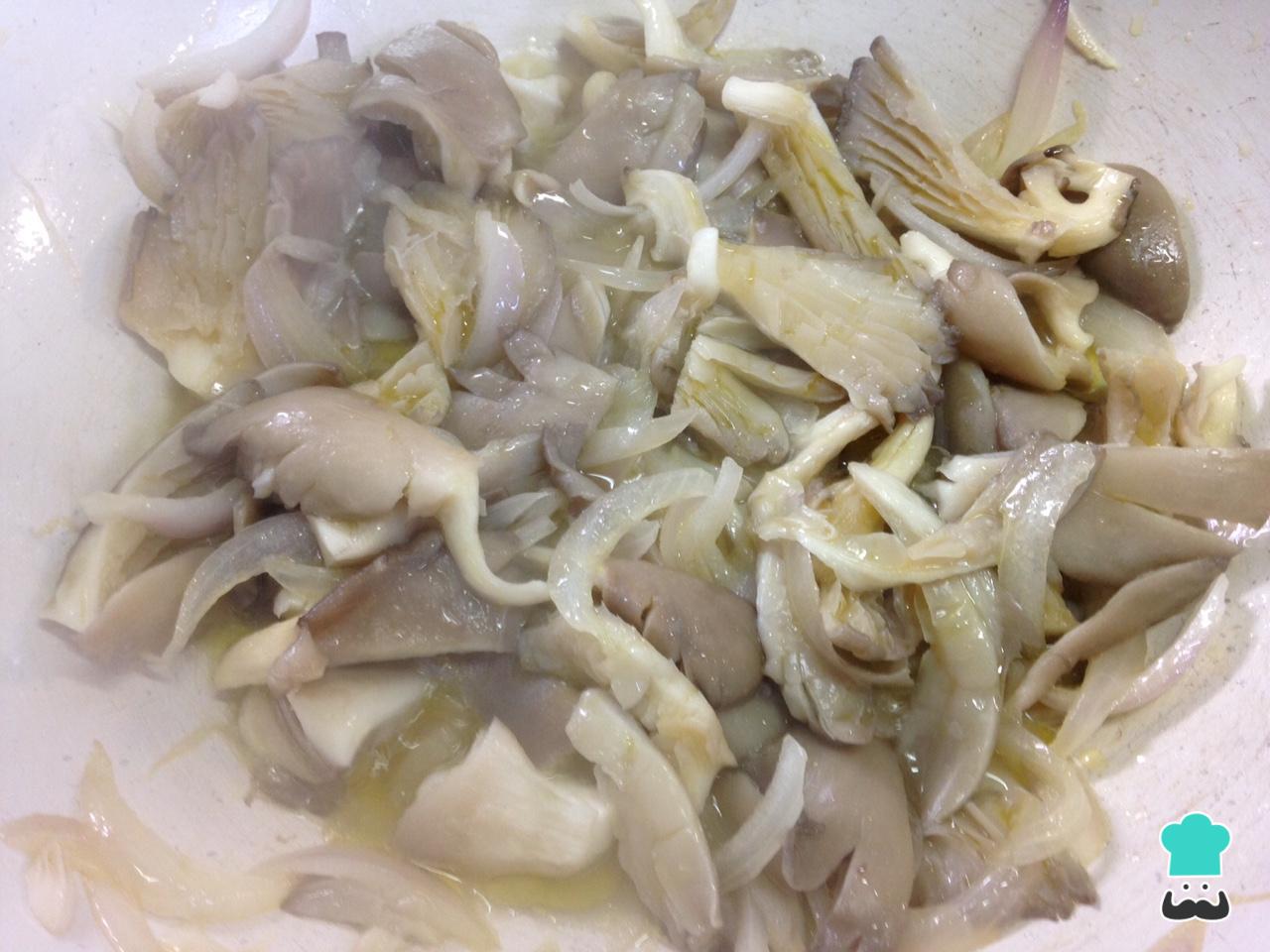 Quando a cebola ficar transparente, acrescente os cogumelos limpos e cortados em pedaços. Misture e deixe cozinhar em fogo médio por 1-2 minutos.