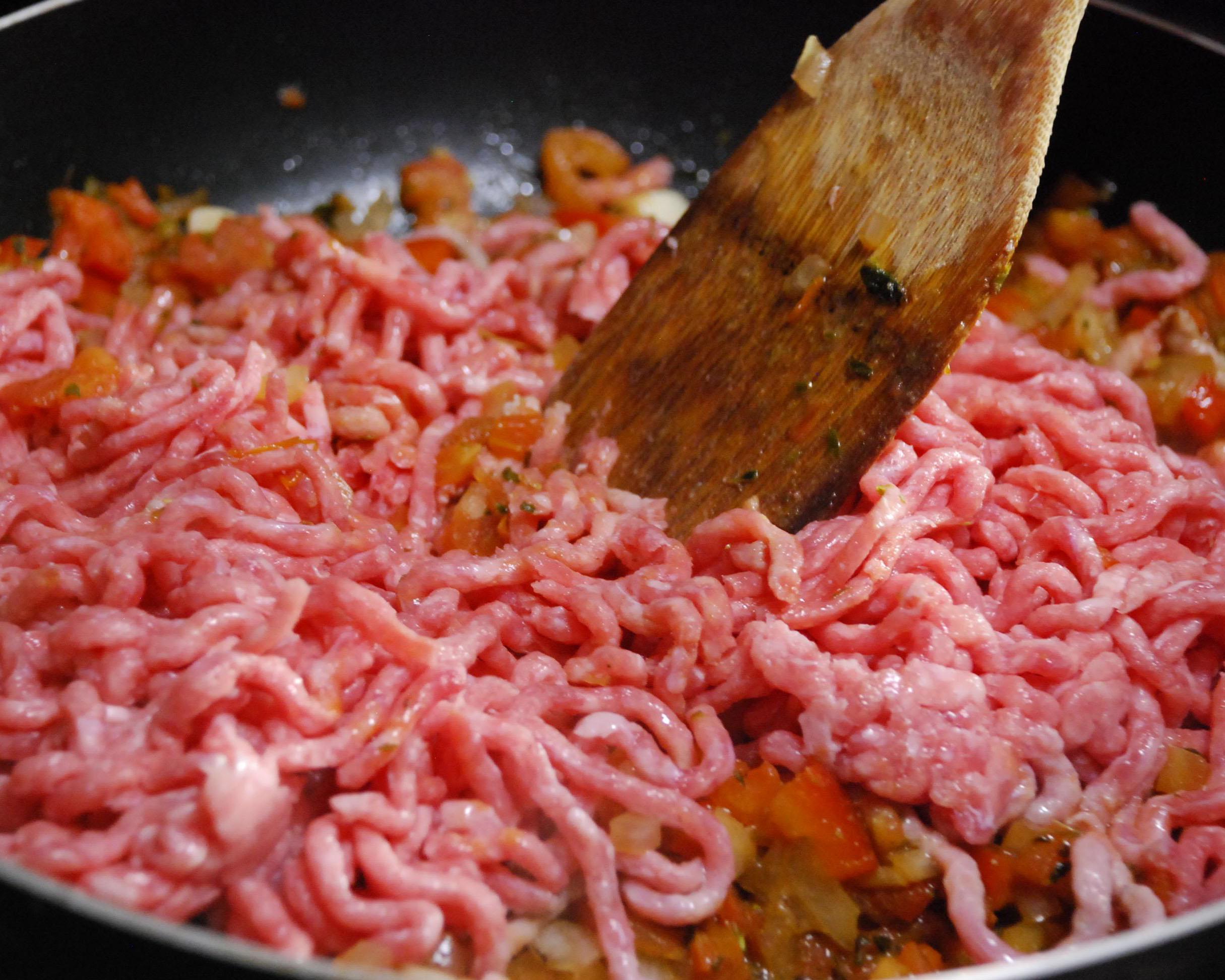 Leve ao fogo médio uma panela com o azeite e refogue a cebola, os alhos e o pimentão até murchar. Junte a folha de louro e a carne e fique mexendo para desfazer a carne. Tempere com sal e pimenta e deixe a carne cozinhar até mudar de cor.