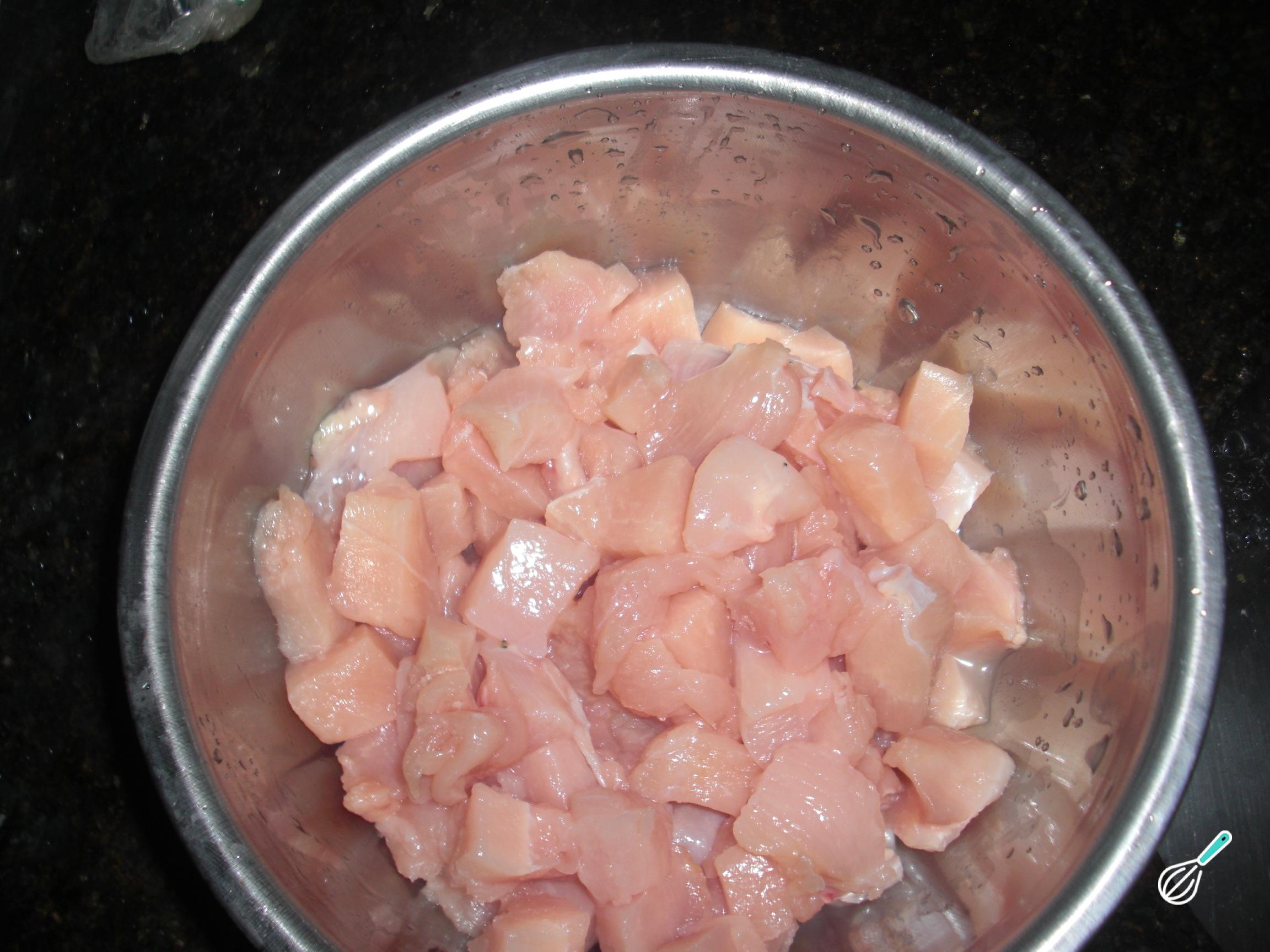Para preparar esta receita de macarrão com frango e molho branco, comece por cortar o peito de frango em cubinhos ou tirinhas médias, e temperar com sal, pimenta e alho em pó a gosto.