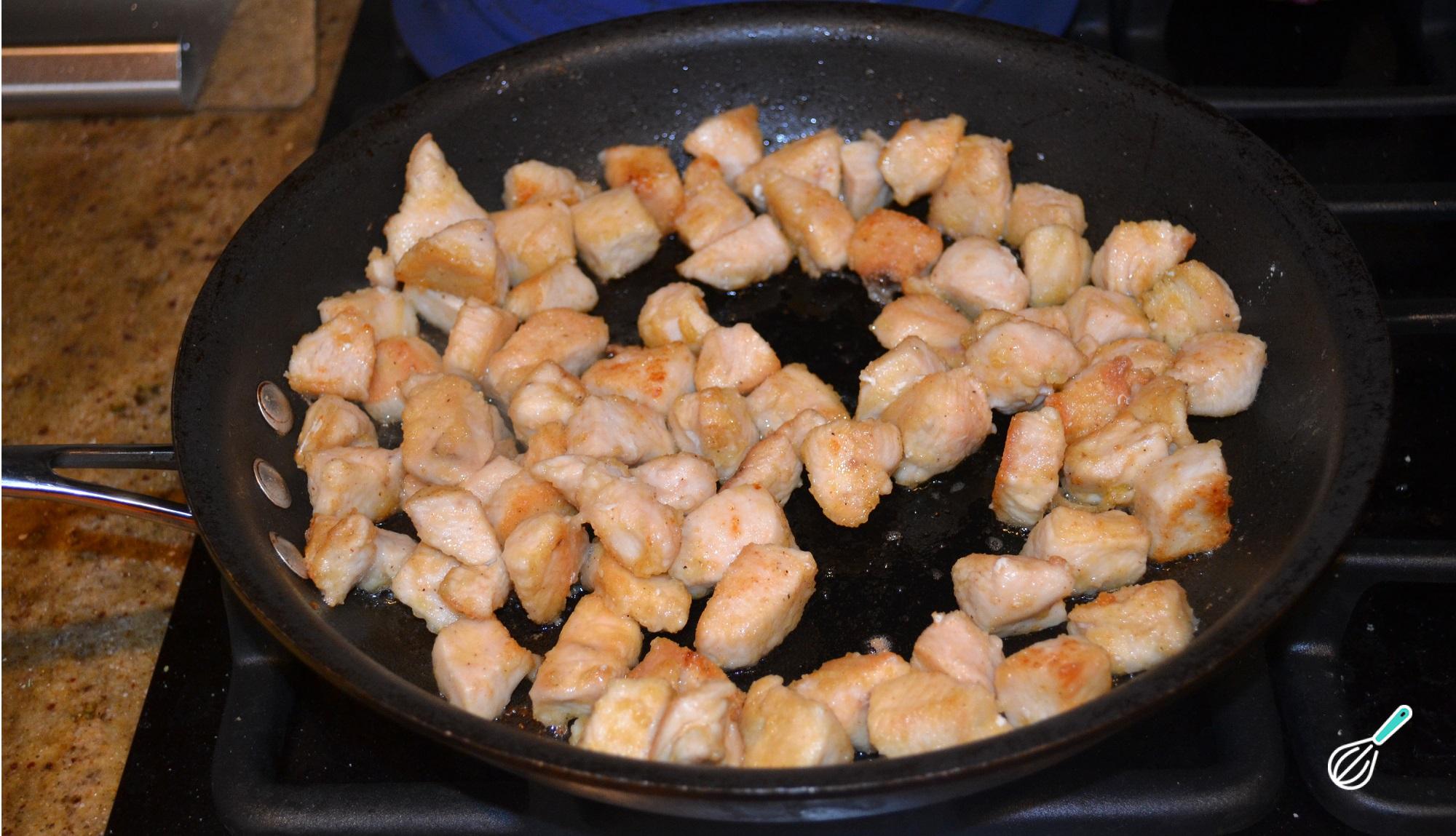 Leve ao fogo médio-baixo uma frigideira grande com o azeite e, quando estiver quente, adicione o frango. Deixe cozinhar por 10-15 minutos, mexendo de vez em quando, até ficar douradinho.