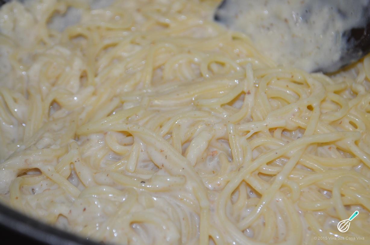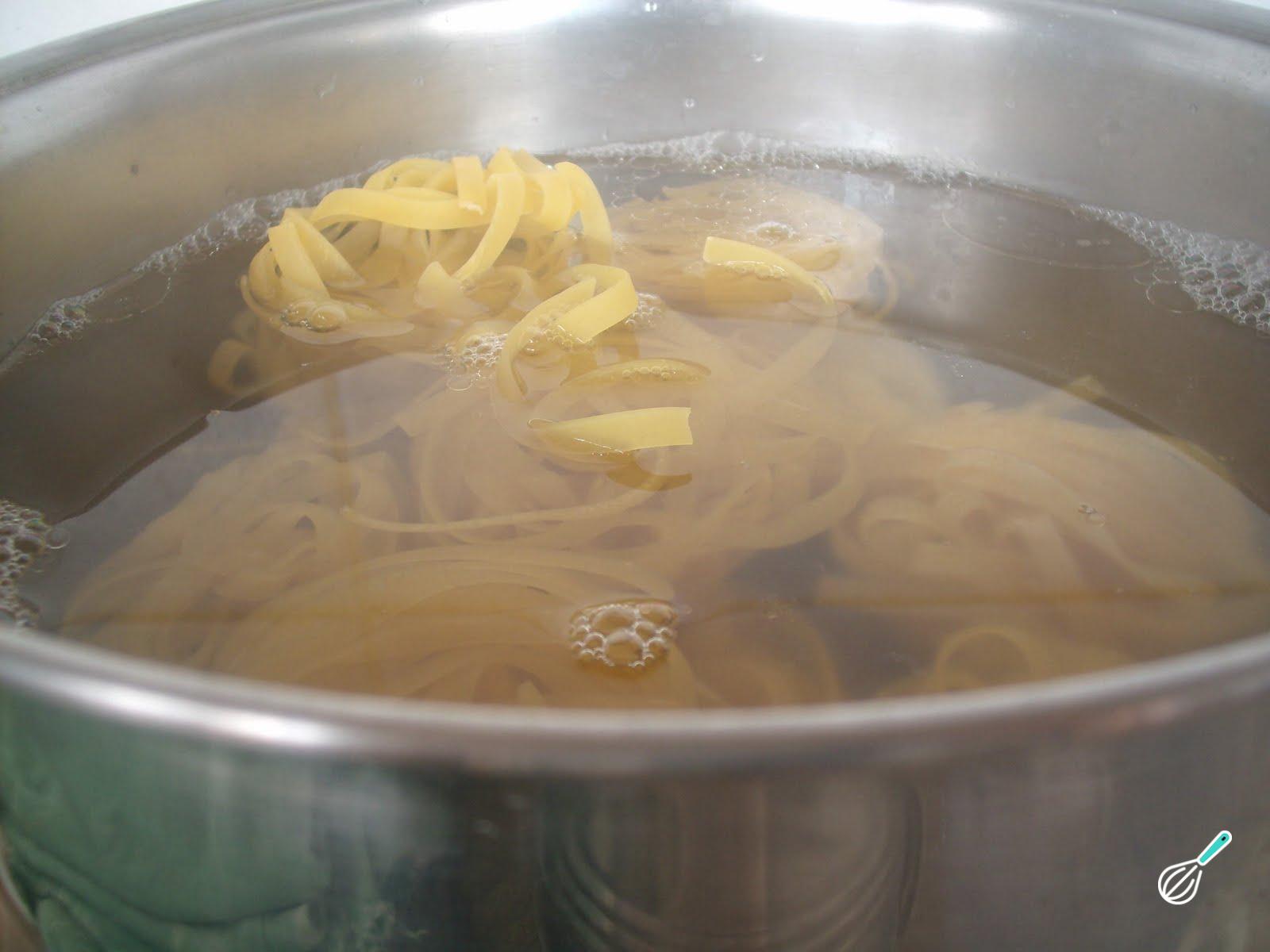 Enquanto isso, cozinhe o macarrão numa panela com água fervente e um pouco de azeite, pelo tempo indicado na embalagem, ou até ficar ao seu gosto.