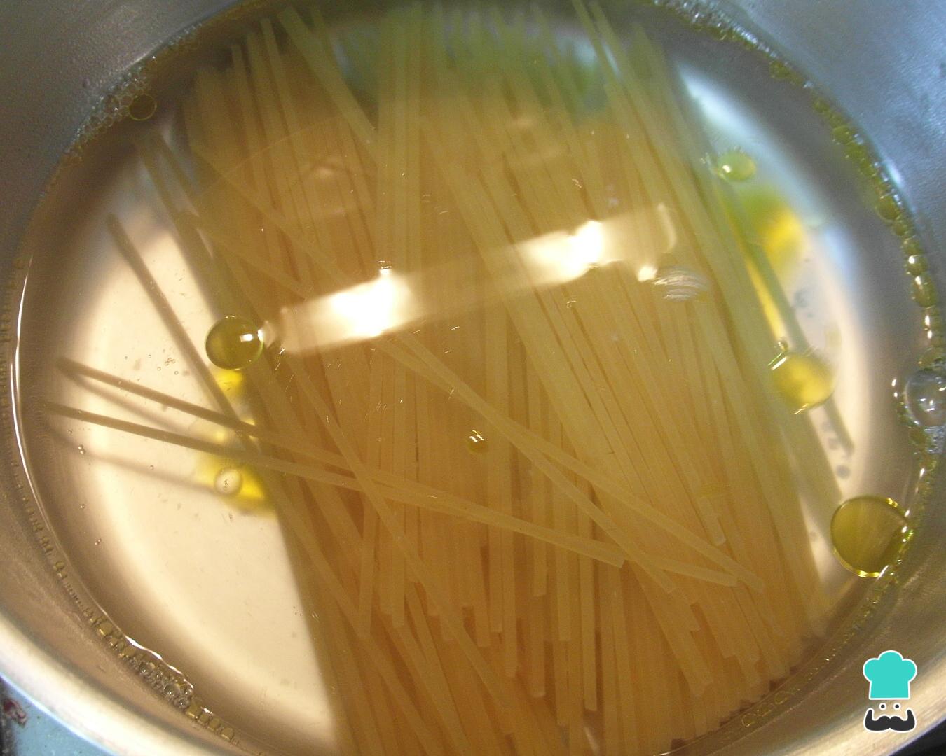 Para fazer esta macarronada fácil comece por cozinhar o macarrão em um tacho com água fervente, um pouco de sal e um fio de azeite de oliva.