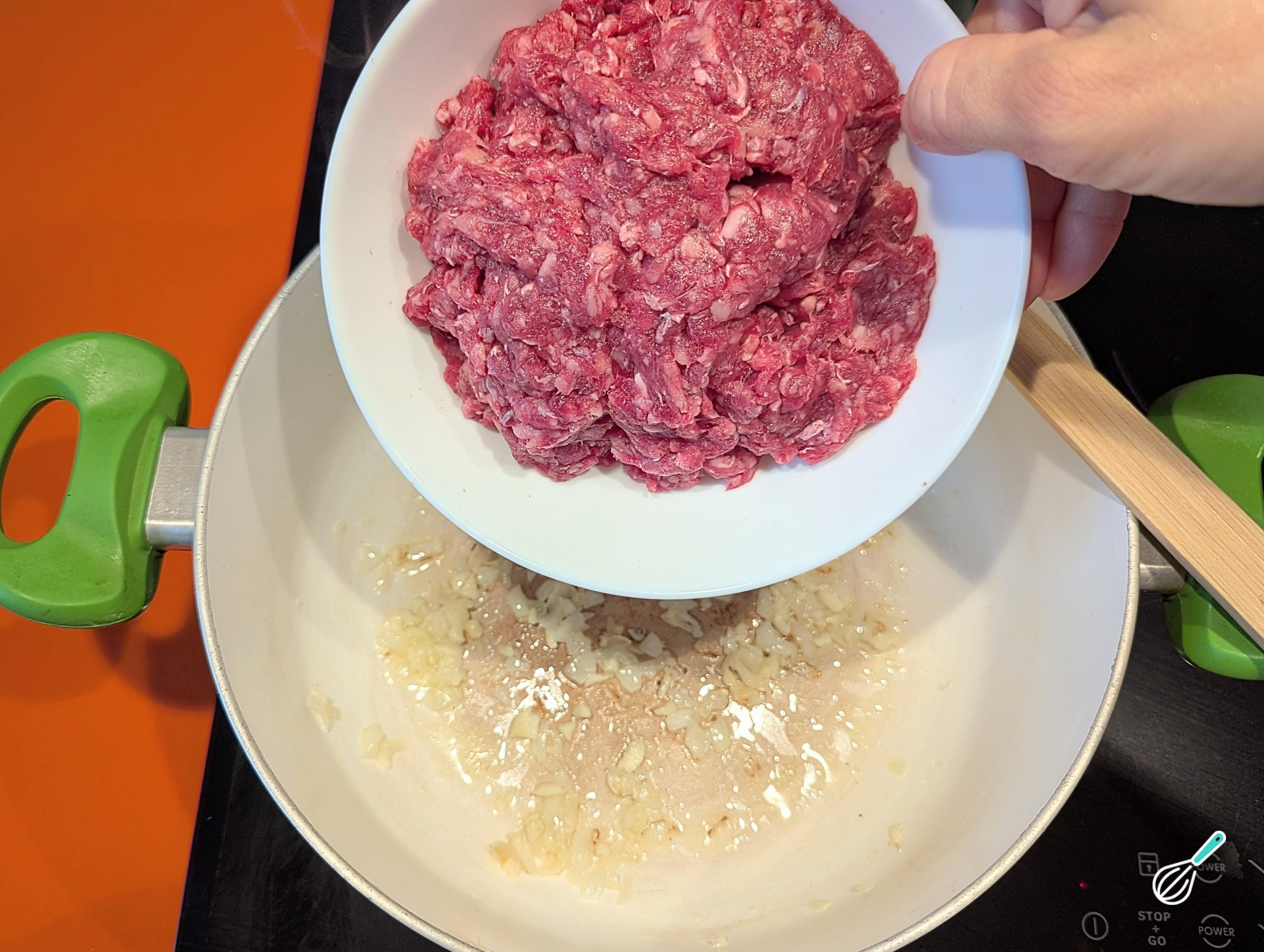 Acrescente a carne moída e refogue bem, mexendo até que ela fique bem soltinha e cozida.