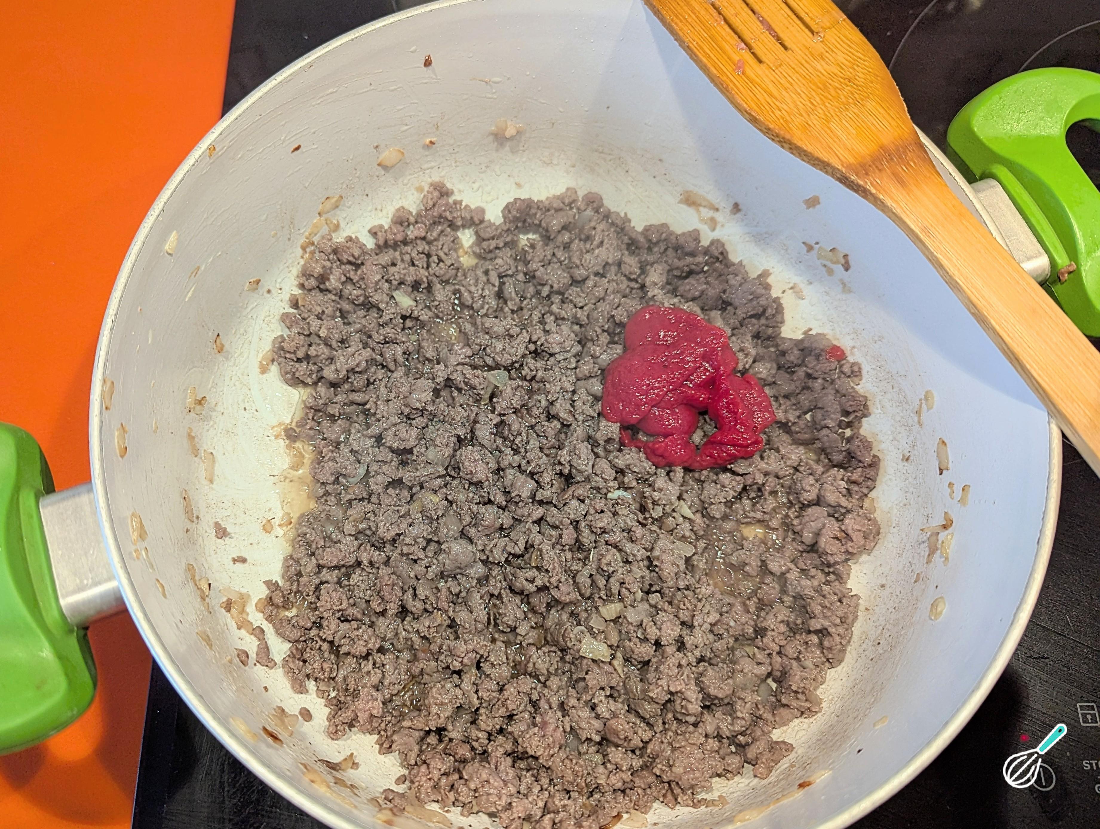 Adicione o extrato de tomate e deixe fritar junto com a carne, mexendo bem para que libere sabor, aroma e colocação.