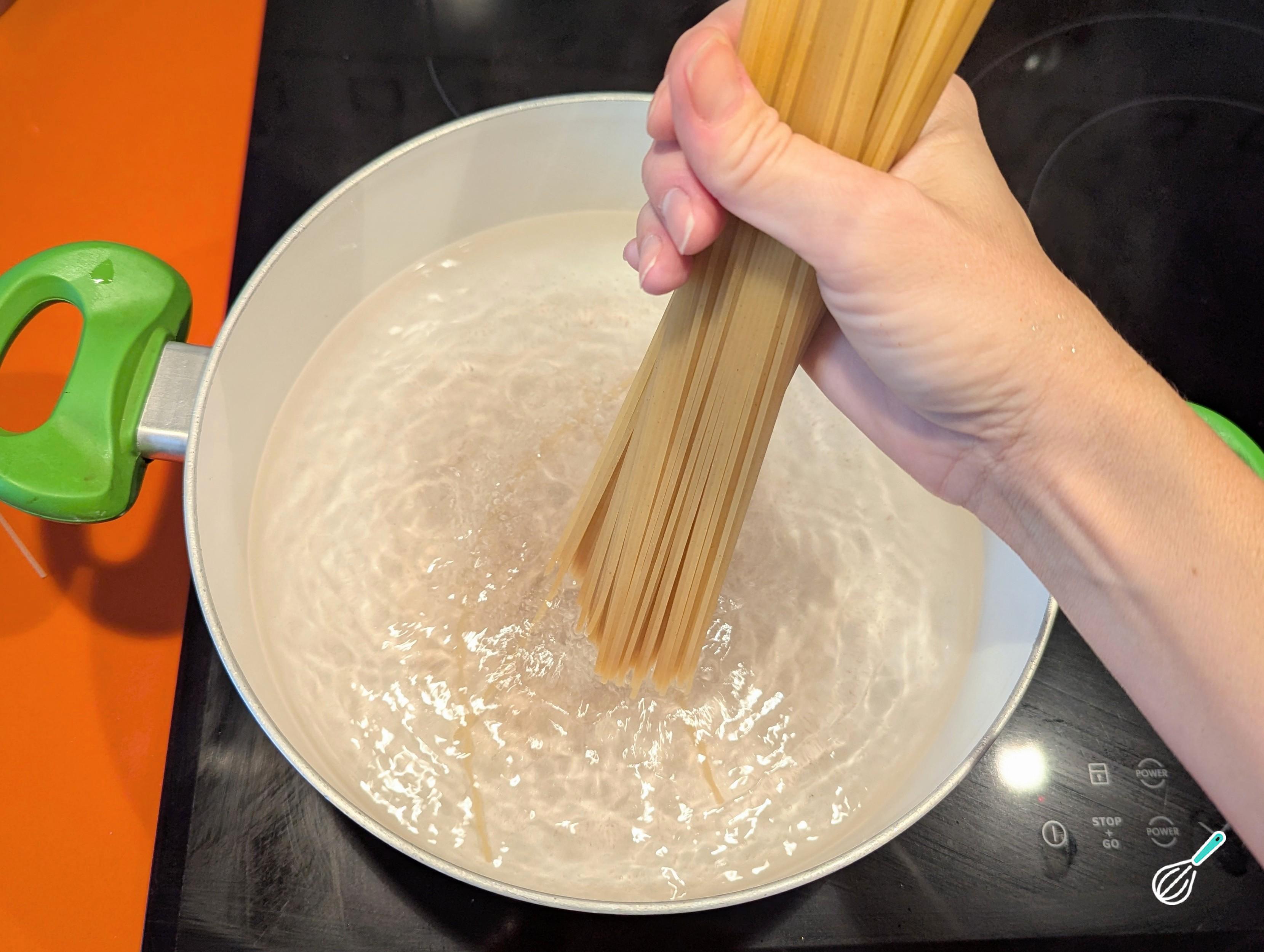 Em uma panela grande, coloque bastante água e uma colher de sal. Quando ferver, adicione o macarrão e cozinhe até ficar al dente (macio, mas com uma leve consciência ao morder). Siga o tempo indicado na embalagem.