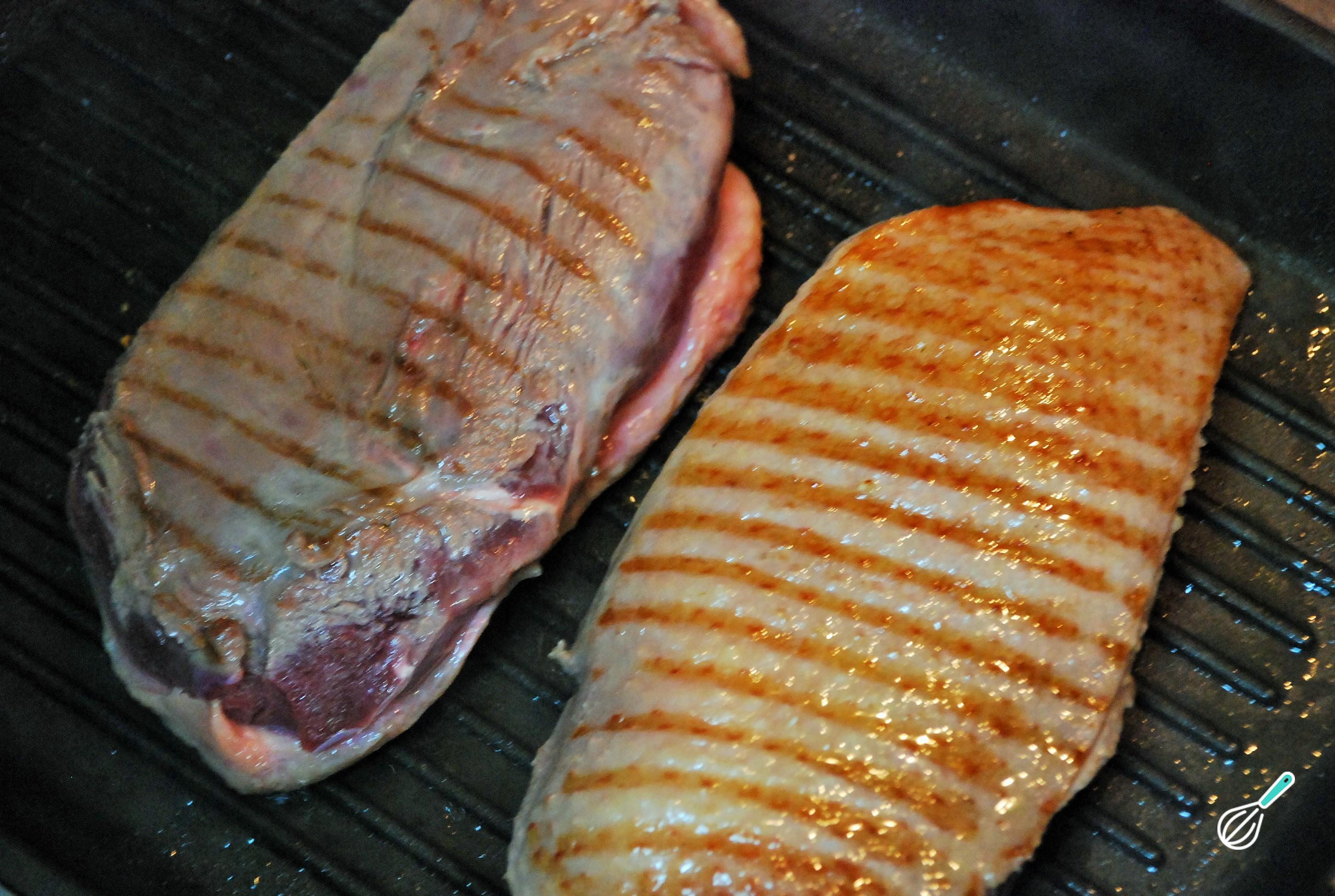 O passo seguinte é para selar a carne: cozinhe o peito de pato numa frigideira ou em uma grelha, em fogo alto, de ambos os lados, até que se forme uma crosta dourada. Isto é importante para que a carne não perca seus sucos enquanto assa no forno.