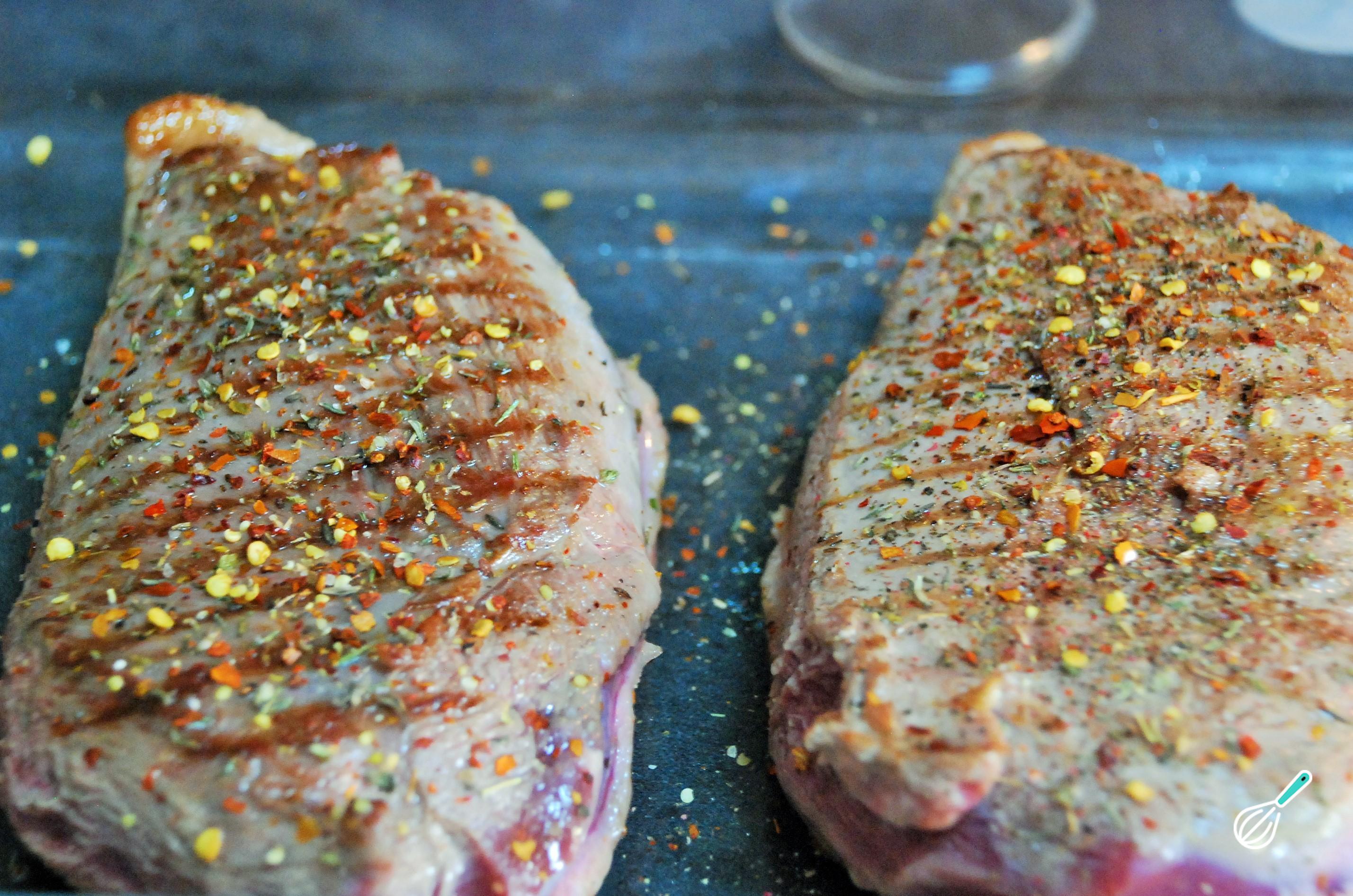 O passo seguinte do magret de pato no forno é colocar a carne em uma assadeira e temperar a gosto com as especiarias, de ambos os lados. Neste caso eu usei diferentes tipos de pimenta, tomilho e sementes de mostarda.