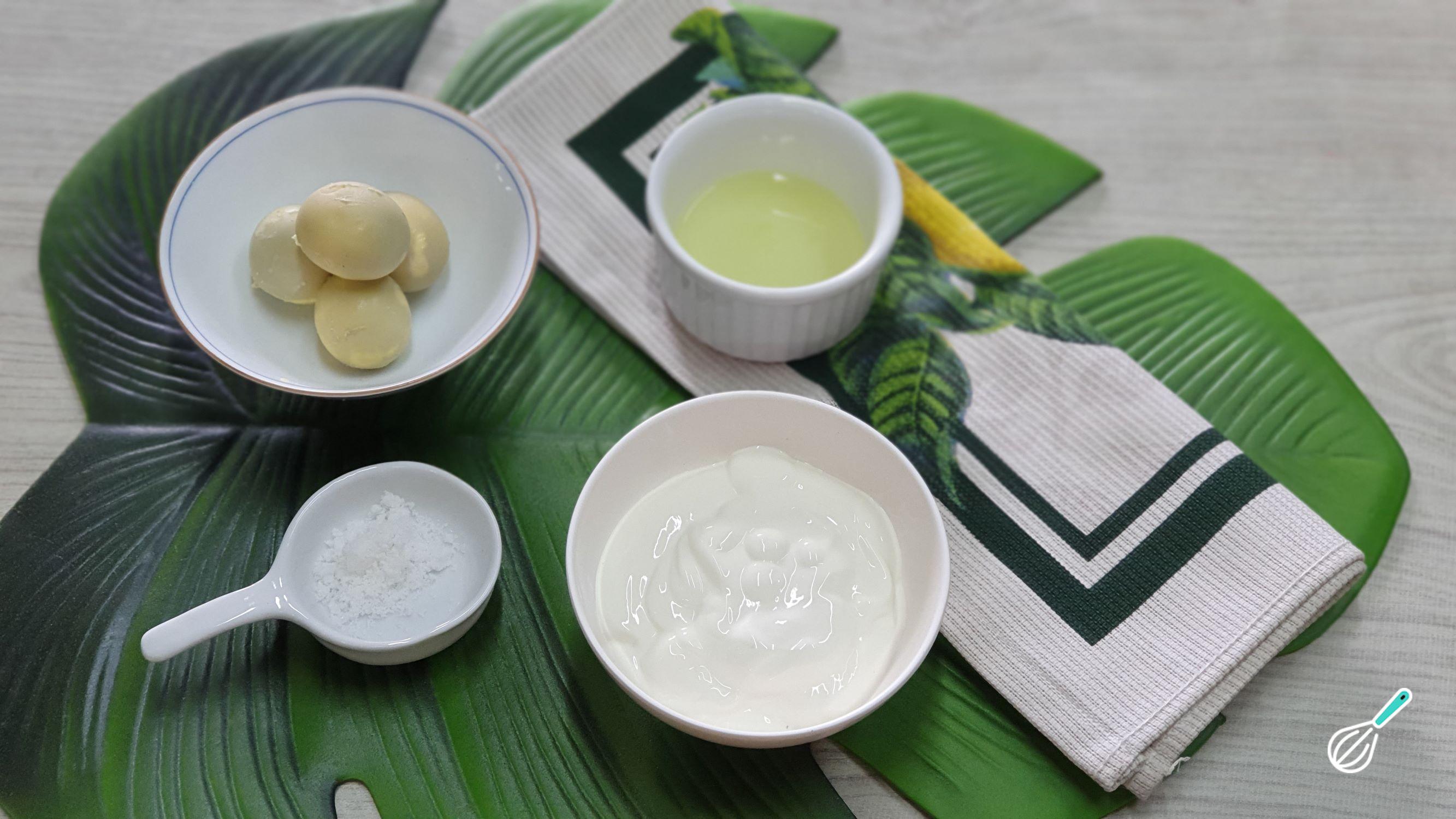 Separe todos os ingredientes desta receita de maionese com ovo cozido. É importante que as gemas de ovo estejam cozidas em ponto duro e já frias. Esprema o suco do meio limão e coe.