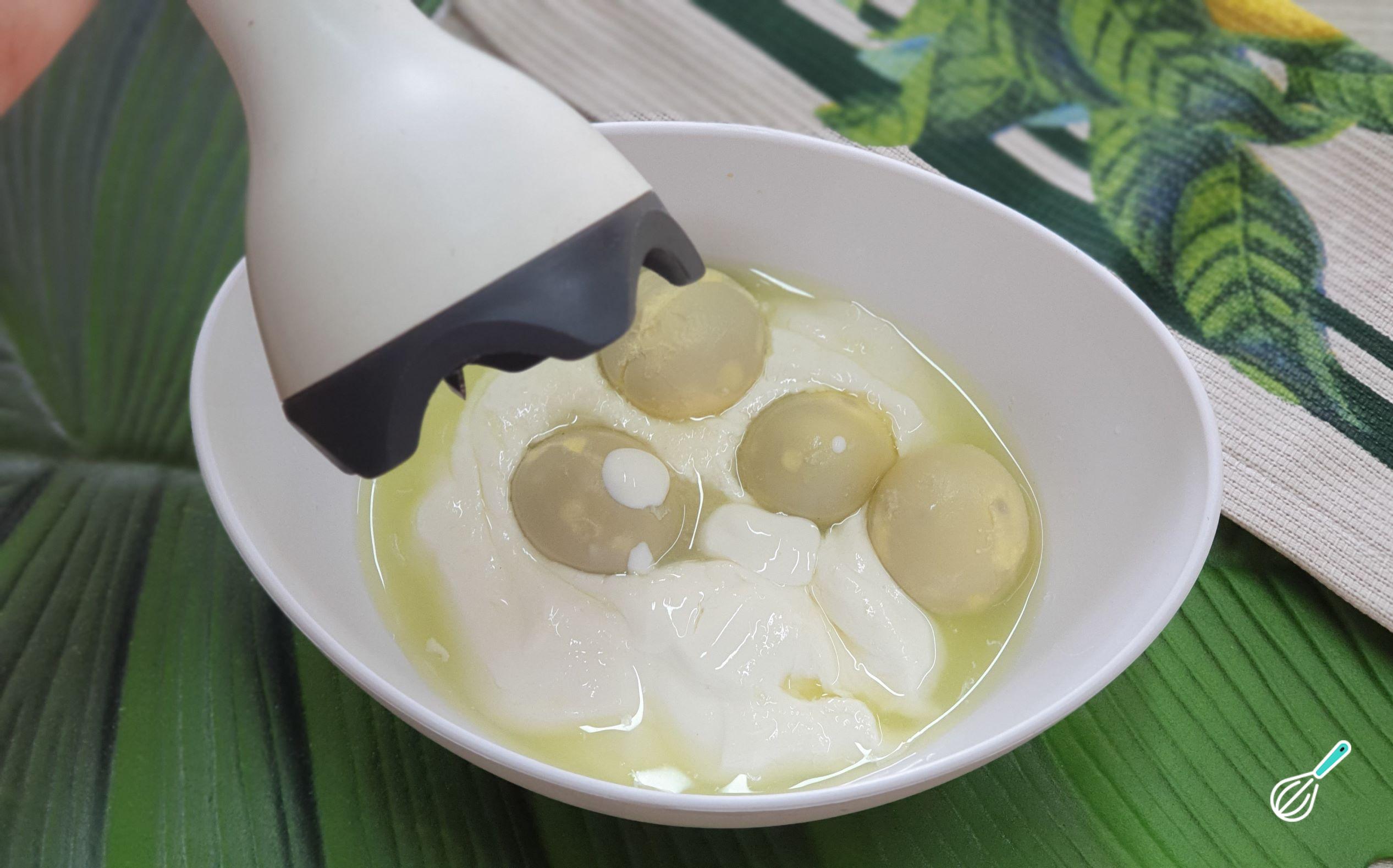 Em uma tigela misture todos os ingredientes e bata com a ajuda de um mixer de mão até que a maionese esteja cremosa e sem pedaços de gema.