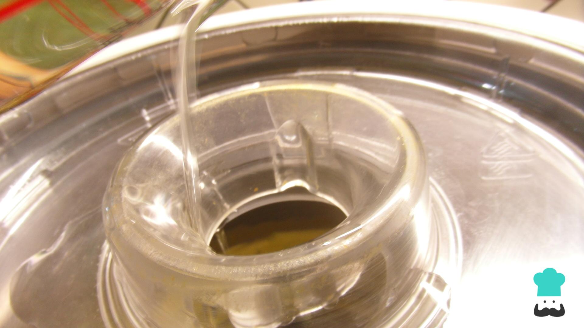 Sem parar de mexer, adicione o óleo lentamente pelo orifício no topo, num fio bem fino. É necessário ser paciente neste passo, para que a maionese não desande e fique líquida.