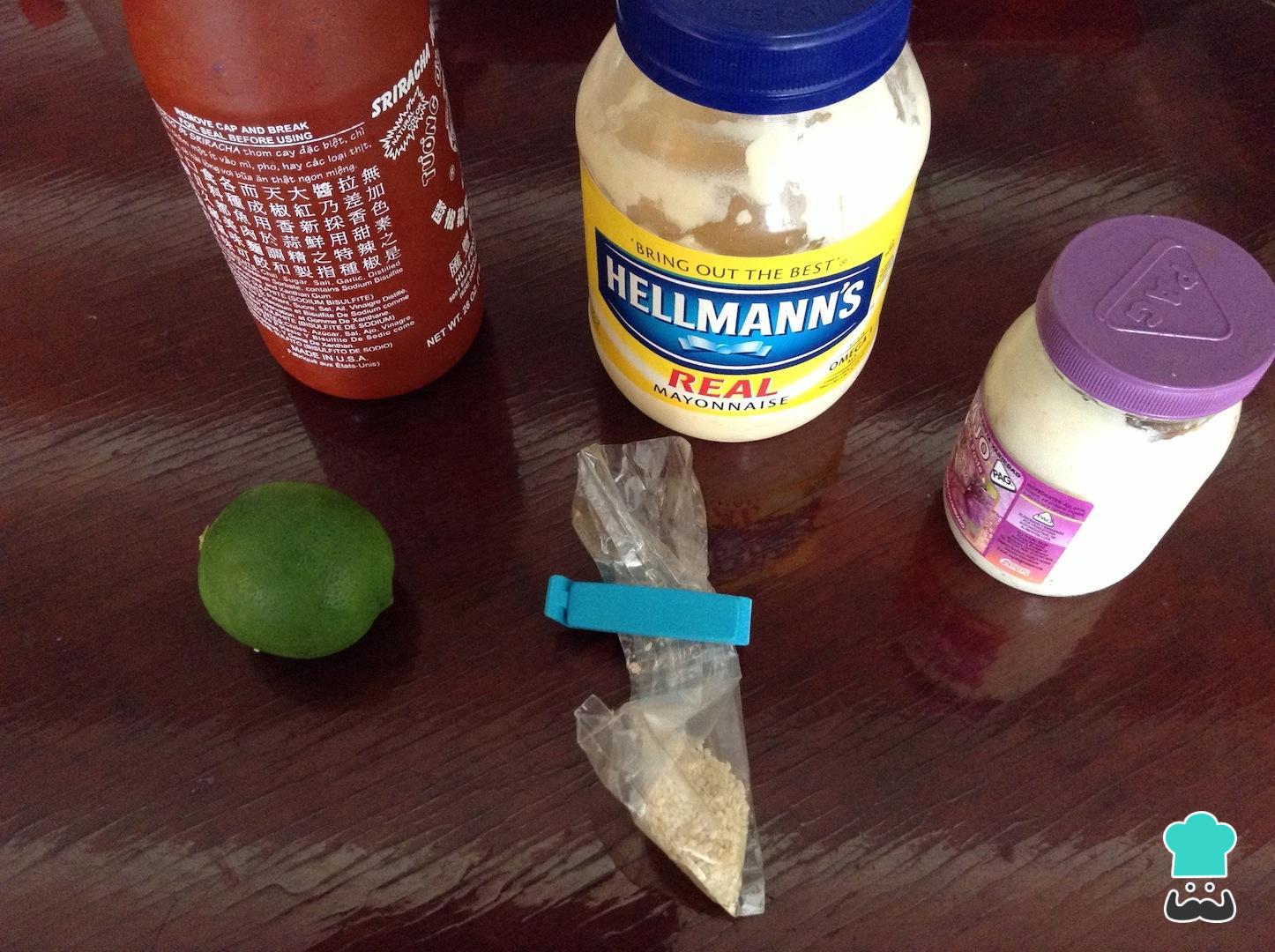 Para fazer esta maionese oriental comece por reunir os ingredientes necessários. Você pode encontrar o molho sriracha à venda em lojas de produtos asiáticos.