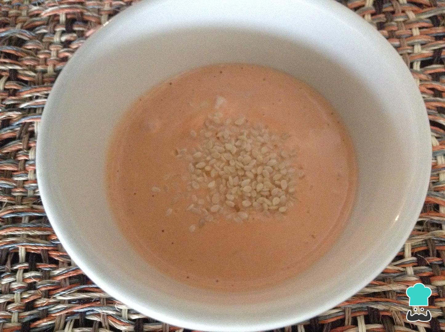 A maionese com sriracha está pronta! Sirva com um pouco de gergelim e use para acompanhar batatas fritas, como molho de sanduíches ou no preparo de frutos do mar. Bom apetite!